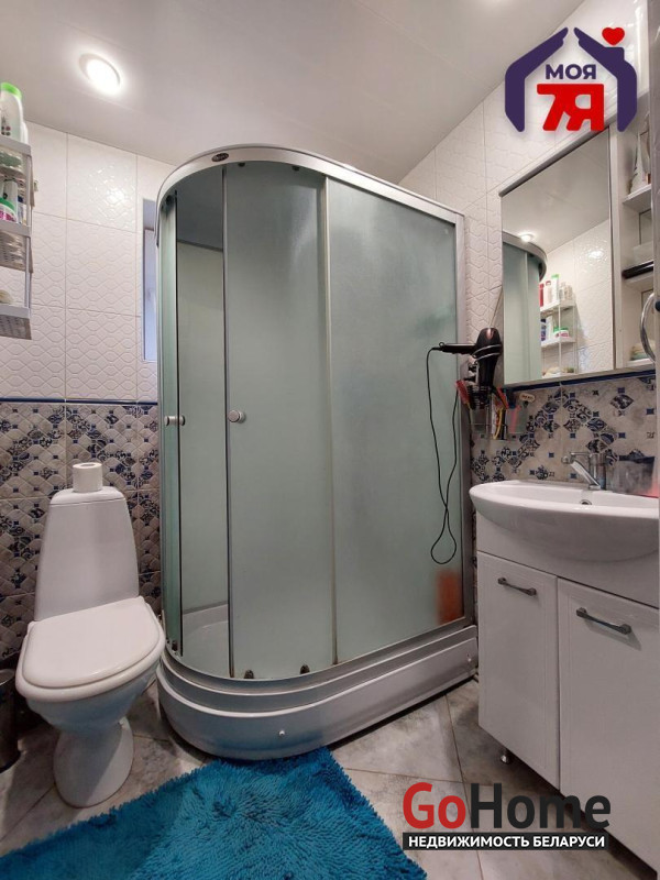 - Совмещенный санузел с душевой кабиной облицован плиткой, что обеспечивает легкий уход и аккуратный вид.
