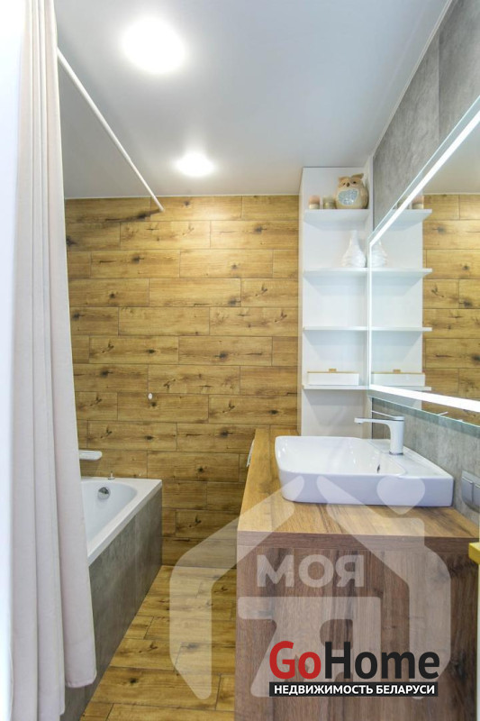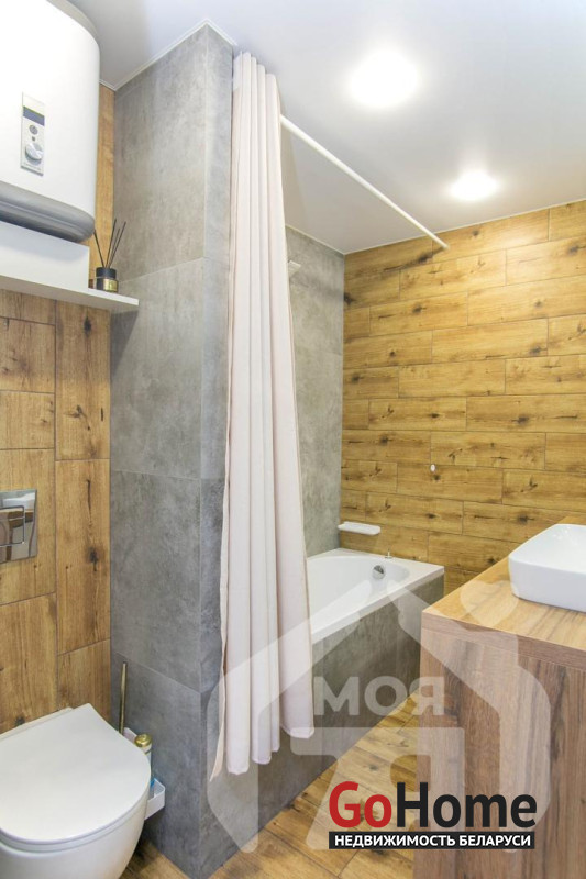 -Санузел совмещенный. Ремонт выполнен в современном и стильном дизайне. Стены облицованы плиткой в нейтральных серых и деревянных тонах, что придаёт помещению элегантность и визуально расширяет пространство. Установлена современная сантехника, есть бойлер, а также функциональные полки.