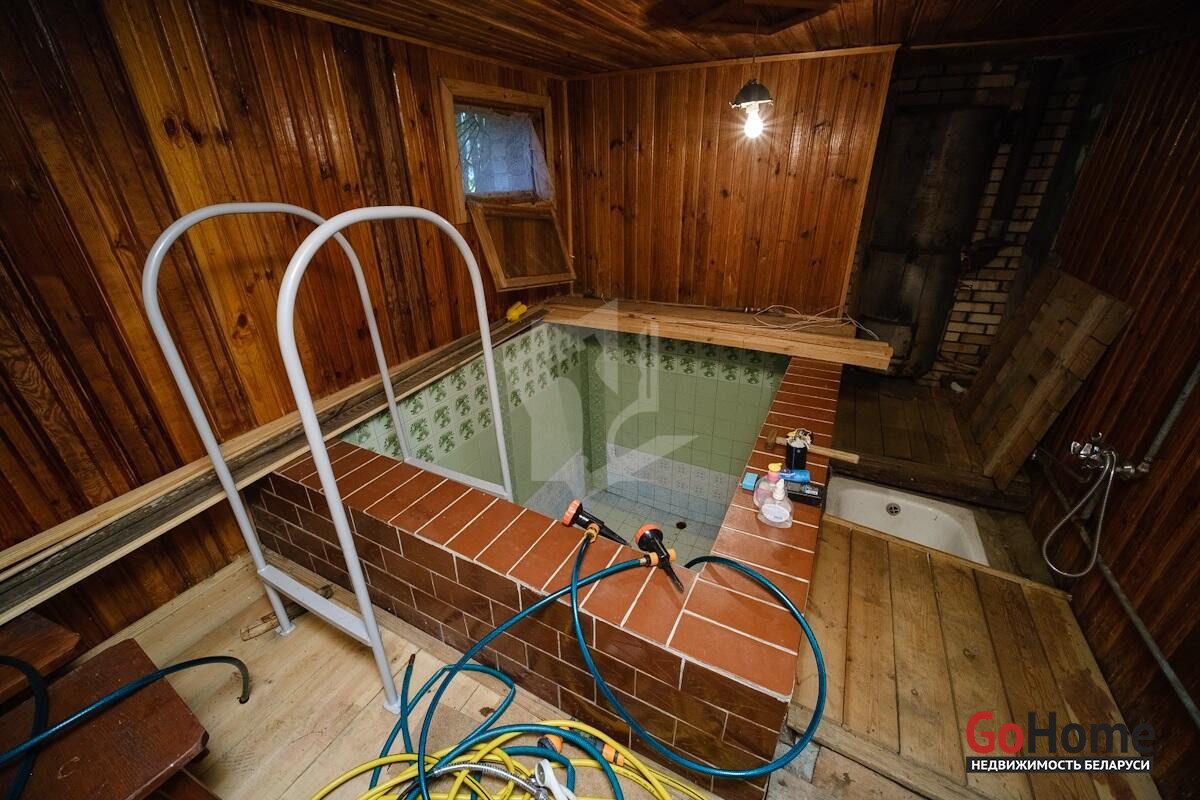 Внутри дом отделан натуральным деревом. В доме есть телефонная линия. Есть большой сухой гараж в цокольном уровне. На территории участка расположена просторная баня с бассейном.