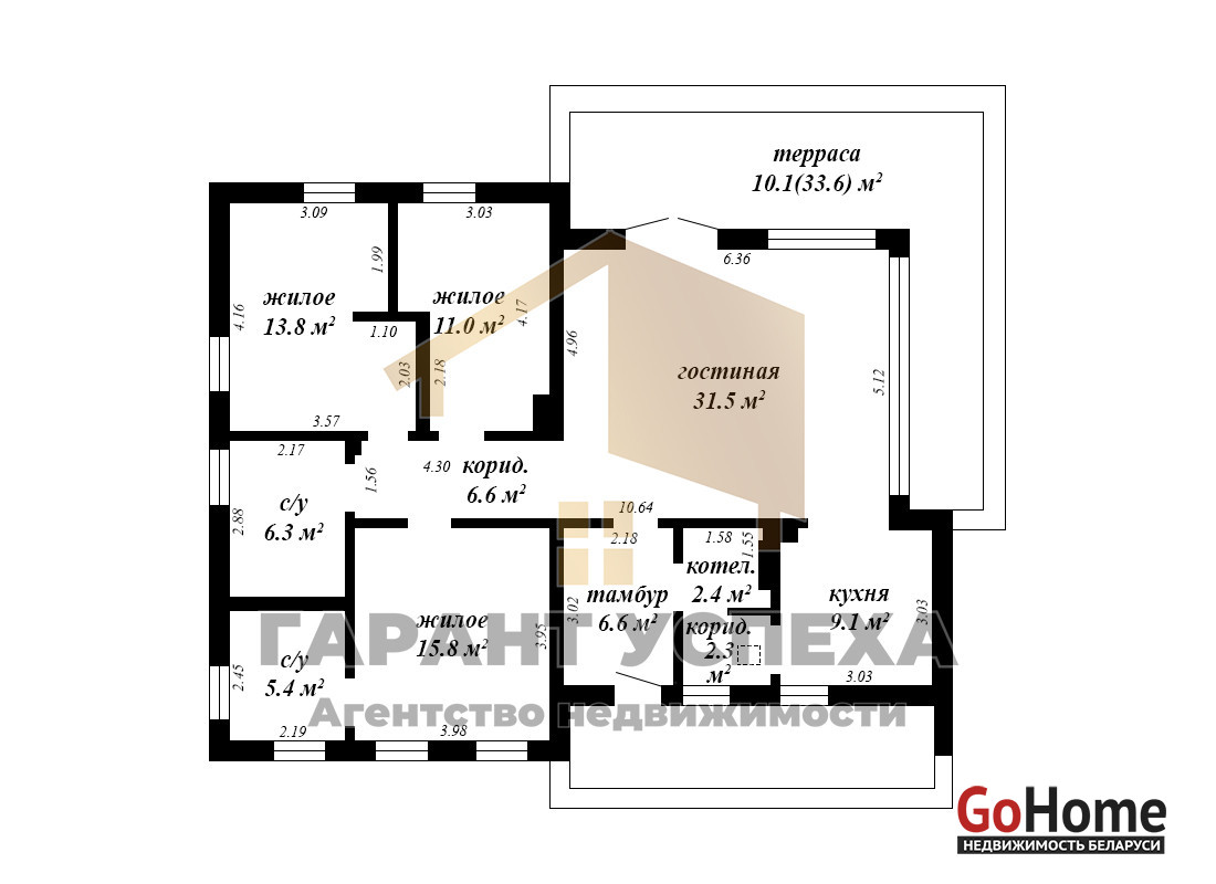 Общая площадь – 109 кв. м, жилая – 50,1 кв. м, кухня – 11,4 кв. м. Высота потолка – 2,9 м. Три жилые комнаты 11/13,8/15,8 кв. м. Высота потолка – 3 м. Большой погреб под котельной. Терраса 33,6 кв. м.