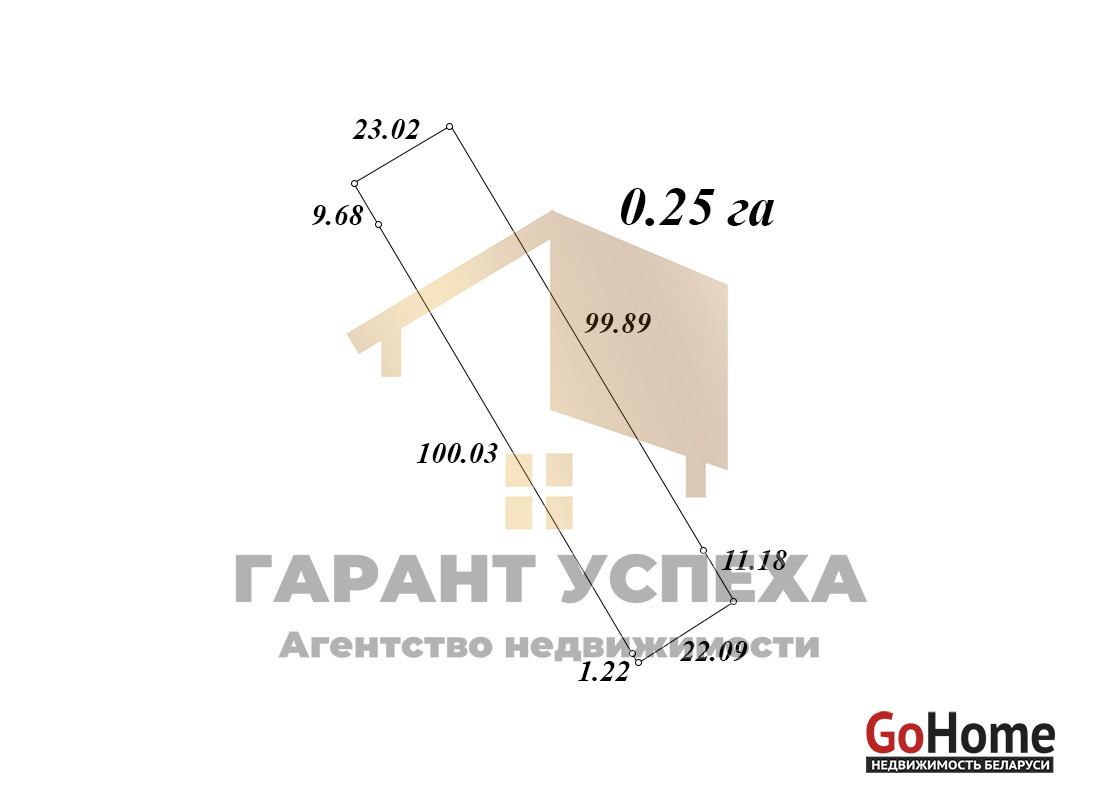 Земельный участок правильной формы размерами 23х110 м и площадью 25 соток огорожен со трёх сторон забором. Форма собственности земли - частная (приватизирован).