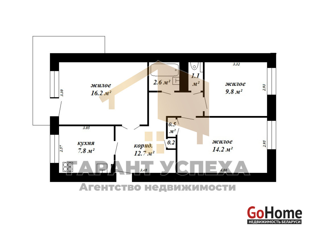 Общая площадь - 67,1 кв.м, жилая площадь - 40,2 кв.м, площадь кухни: 7,8 кв.м.