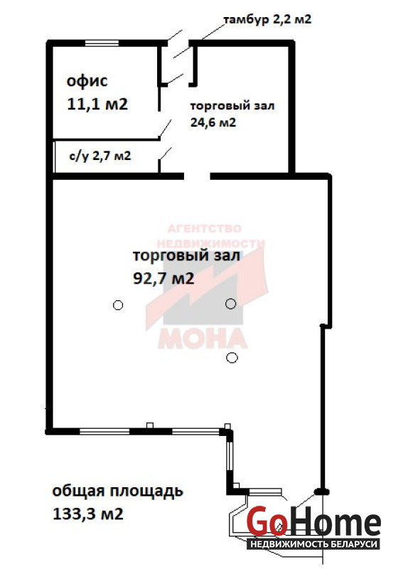 Общая площадь помещения 133,3 м2; площадь торгового зала 117,3 м2.