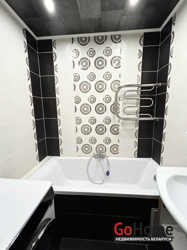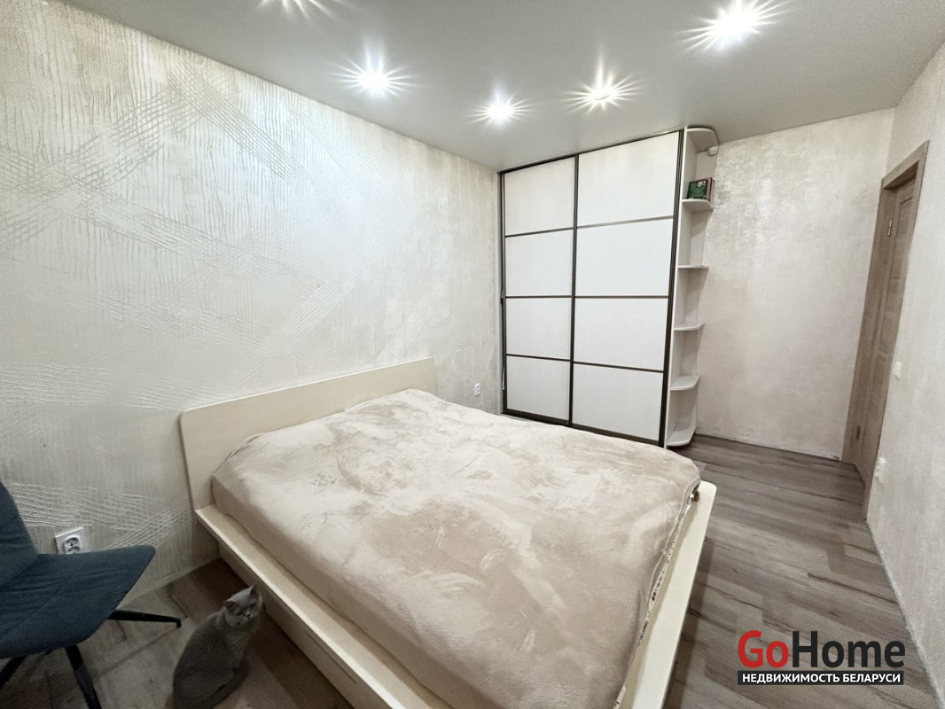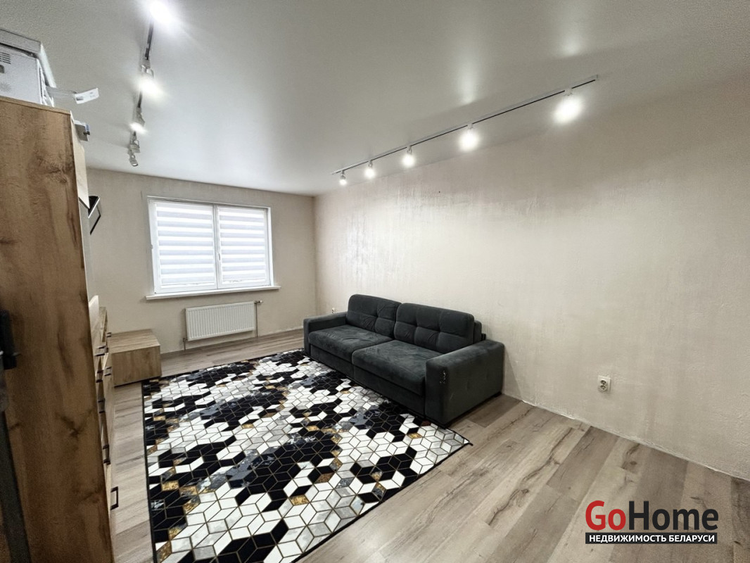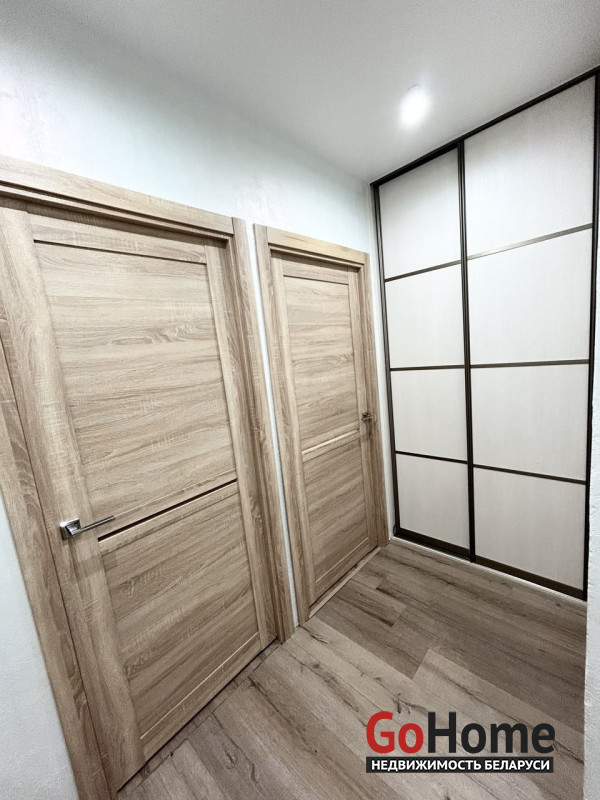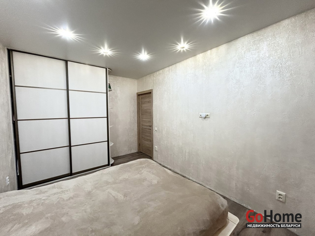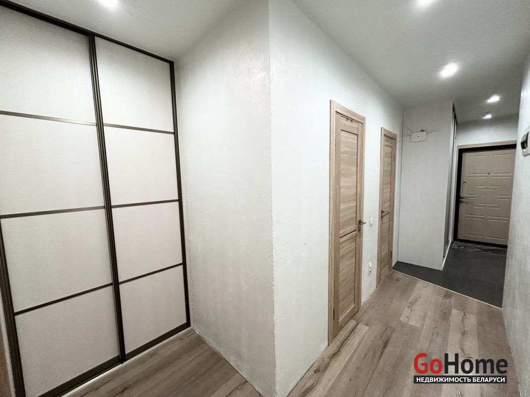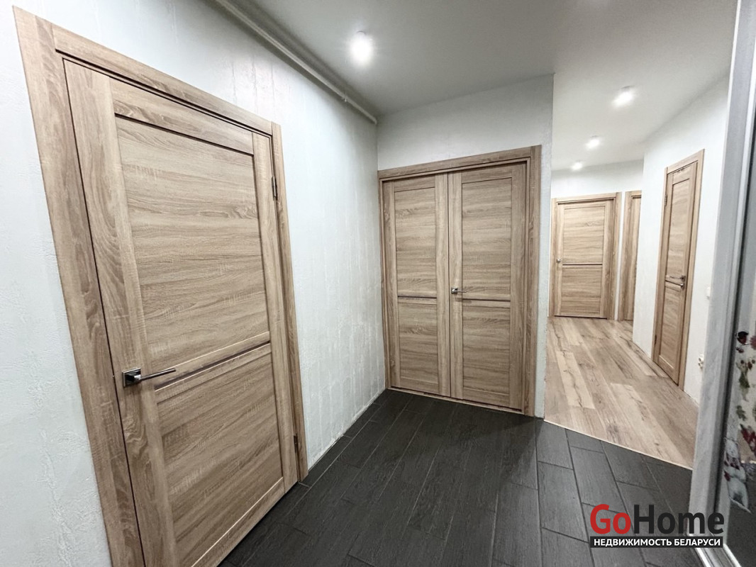 Пол в квартире – ламинат, в прихожей и кухне - плитка. Потолки – натяжные. На стены нанесена декоративная штукатурка. Санузел раздельный, облицован плиткой. Окна – деревянные стеклопакеты. Металлическая входная дверь, межкомнатные двери в одном стиле.