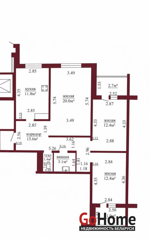 Общая площадь квартиры по СНБ – 79,3 кв.м., общая площадь – 74,7 кв.м., жилая площадь – 44,8 кв.м., кухня – 11,8 кв.м. Высота потолка 2.64 м.