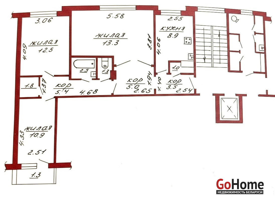Планировка: три комнаты (две комнаты 12.5 и 10.9м2 — на разные стороны, одна большая - 19,3м2).