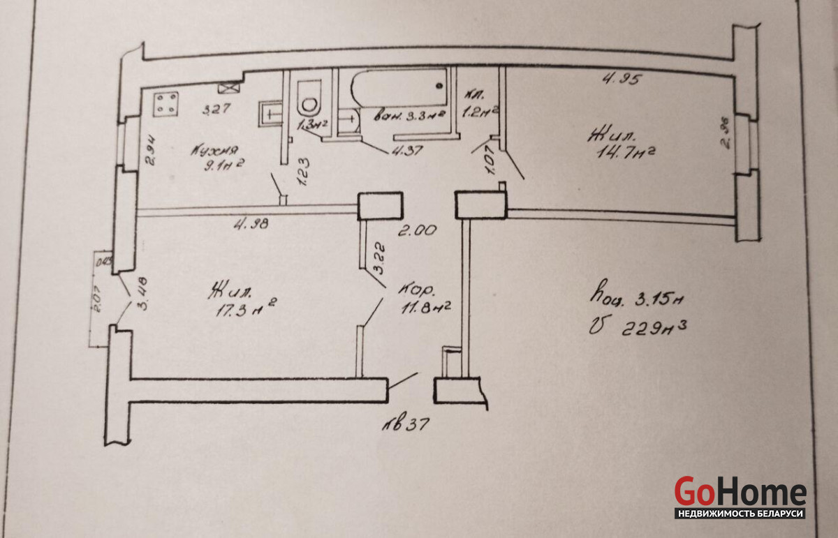 Изолированные комнаты 17.3 и 14.7 .Кухня 9.1 , окна которой выходят