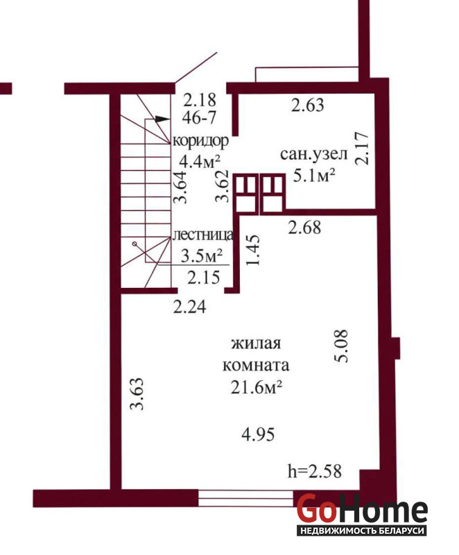 Второй уровень – это место приватности и комфорта. Здесь расположился просторный санузел 5,1 м² и жилая комната площадью 21,6 м².