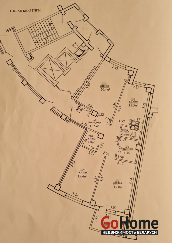 Просторная кухня 11.5 м2, зал 20.4 м2 большие комнаты 17.0 м2, 15.4 м2 . Лоджия 4.2 м2.