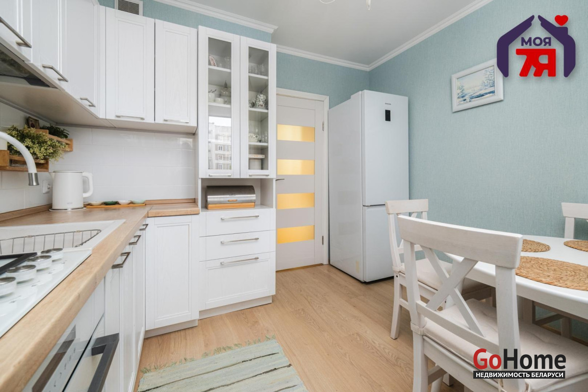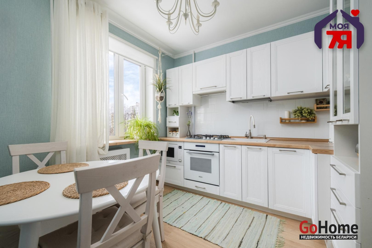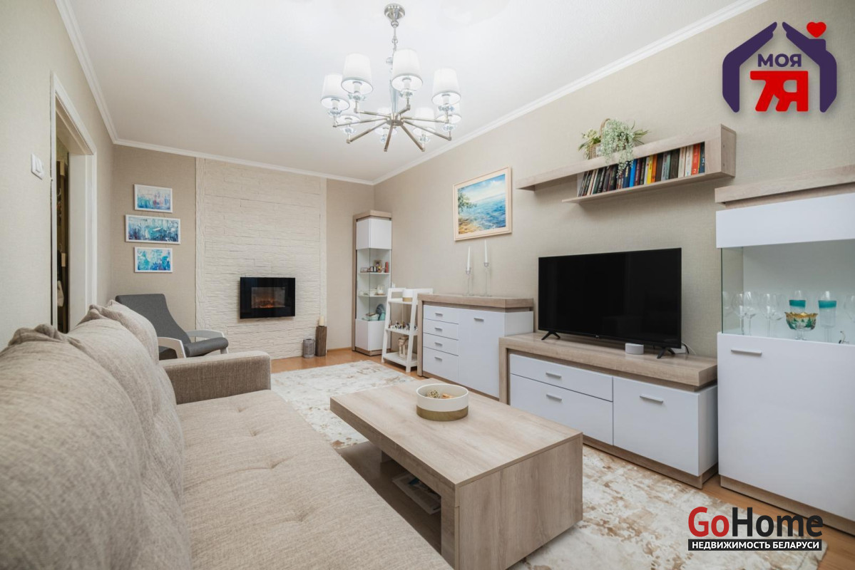 - Квартира общей площадью 51 кв.м и кухней 8,9 кв.м. Планировка с изолированными комнатами позволяет чётко разделить жилые зоны. Окна выходят во двор, что снижает уровень уличного шума.- Выполнен качественный ремонт, состояние позволяет заехать без дополнительных вложений. Установлена металлическая входная дверь и двухкамерные стеклопакеты. Полы покрыты ламинатом, стены оформлены светлыми обоями. В гостиной установлен электрокамин шведского производства, часть мебели выполнена из массива, что повышает износостойкость интерьера.- Санузел раздельный и облицован современной плиткой. Установлены ванна и стиральная машина.- Кухня оборудована гарнитуром из массива и бытовой техникой польского производства. В наличии холодильник, газовая плита, духовой шкаф и встроенная микроволновая печь, что закрывает основные бытовые потребности.- Есть обустроенная лоджия, подходящая для хранения или дополнительного функционального пространства.- В прихожей размещён вместительный шкаф купе и отдельный шкаф для верхней одежды, что упрощает организацию хранения.- Квартира расположена на четвёртом этаже десятиэтажного панельного дома 1999 года постройки. Дом в хорошем состоянии, установлен новый лифт, что повышает удобство ежедневного использования.- Район с развитой инфраструктурой и удобной транспортной доступностью. До станции метро «Московская» около семи минут пешком. До торгового центра Dana Mall одна станция на метро или около двадцати пяти минут пешком.- В пешей доступности находятся телецентр, киностудия «Беларусьфильм», Центр олимпийского резерва и Республиканский экологический центр. Рядом расположен бассейн с банями и теннисные корты. В районе работают три продуктовых магазина, доступны детский сад, школа и лицей искусств.- Для прогулок рядом расположен Парк Челюскинцев и канал с водопадами Слепянской водной системы. В соседнем квартале Vogue находятся кофейни, до которых можно дойти пешком.