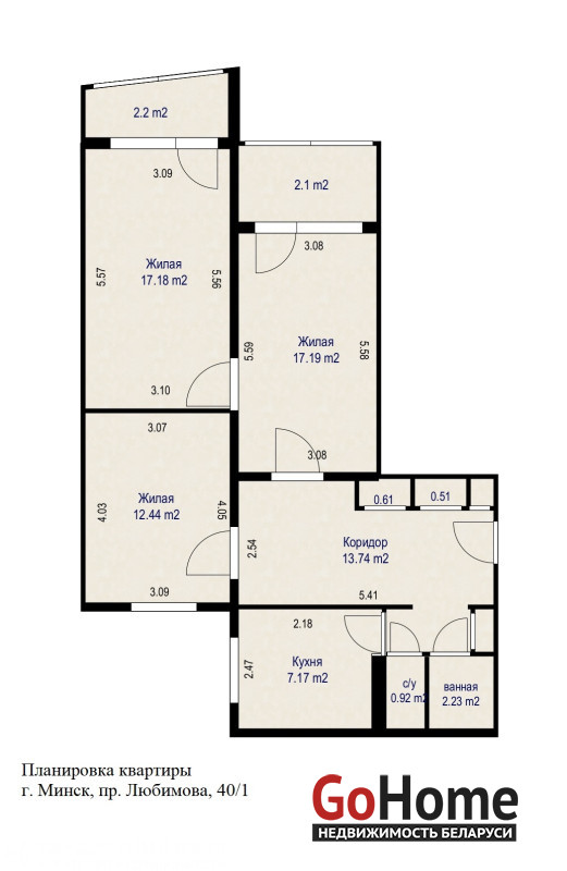 Площадь: 76.96 /жилая 46.81 / кухня 7.17м2.