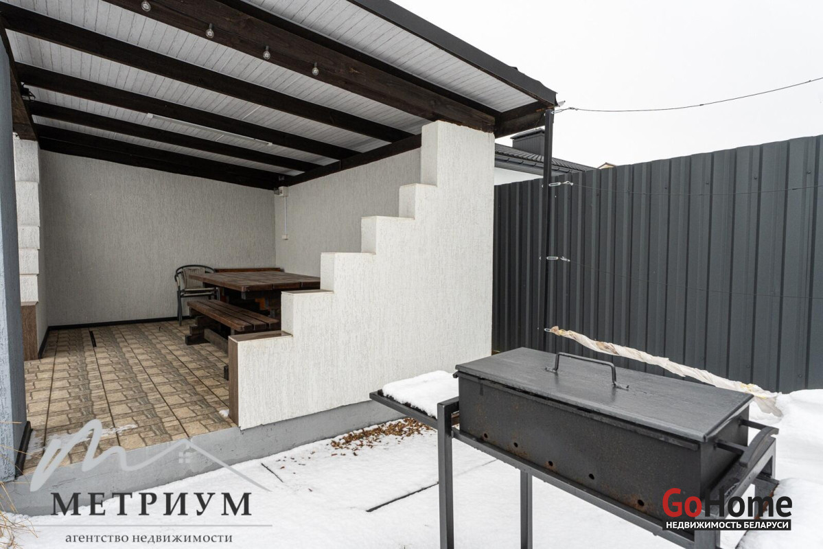 Участок ровный 0.12 га, огорожен по периметру забором (высота забора с фасадной стороны - 2,30 м.), установлены откатные ворота с автоматикой, есть отдельная беседка с погребом, качели, 2 парковочных места.