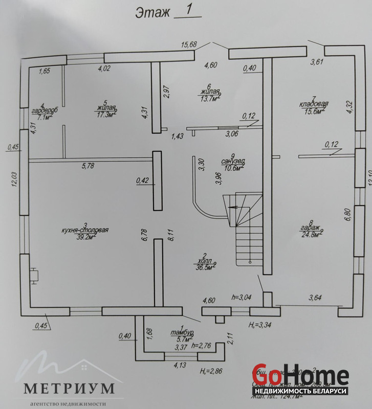 · холл 36,5 кв.м. с выходом в гараж 28,4 кв.м и кладовую 15,6 кв.м;