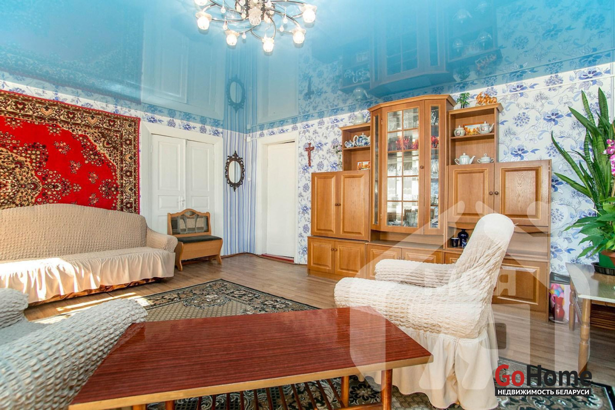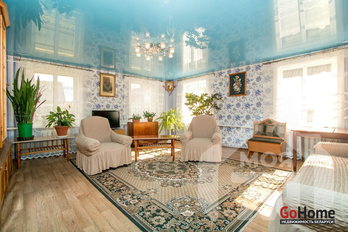 -Натяжные потолки в гостиной добавляют простора и визуального света. На окнах установлены современные стеклопакеты с отличными теплоизоляционными свойствами.