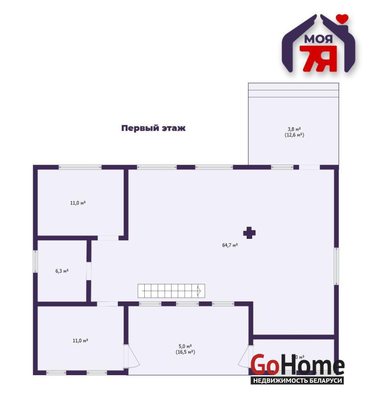 - 1 этаж: кухня - гостиная 64,7 кв.м; гостевая комната 11 кв.м.; гостевой санузел, совмещенный с душевой 6,3 кв.м; прихожая с большой гардеробной 11 кв.м.; открытая терраса 12,6 кв.м; входная группа(крыльцо) 16,5 кв.м.; котельная комната 5 кв.м.