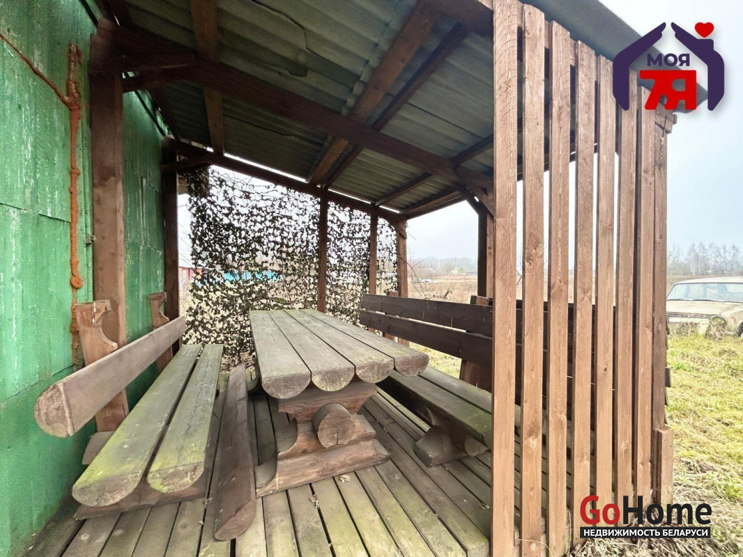- Продумано место для отдыха где располагается беседка из бруса. Также новым владельцам остается теплица из поликарбоната.