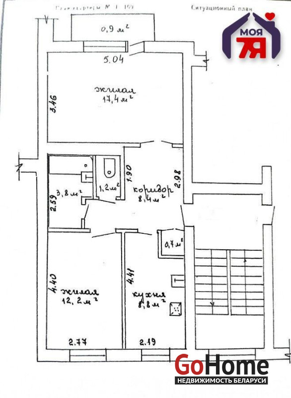 - Общая площадь квартиры по СНБ 53,4 кв.м., при этом площадь жилых комнат составляет 12,2 и 17,4 кв.м., площадь кухни -8,8 кв.м.