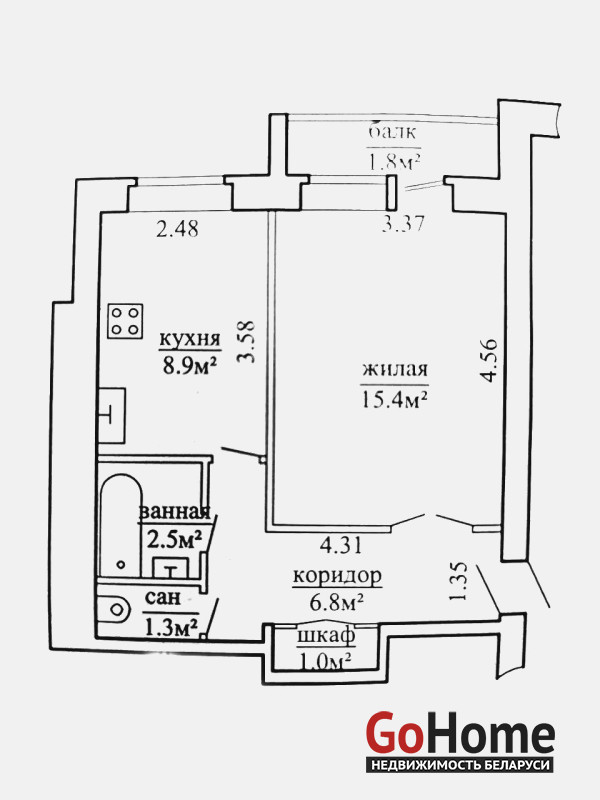 Квартира теплая, сухая, расположена на 1-ом этаже 5-этажного кирпичного дома общей площадью 35,9 кв.м., жилая 15,4 кв.м., кухня 8,9 кв.м., ванная комната - 2,5 кв.м., санузел - 1,3 кв.м. В прихожей (6,8 кв.м) расположен удобный встроенный шкаф (1кв.м).