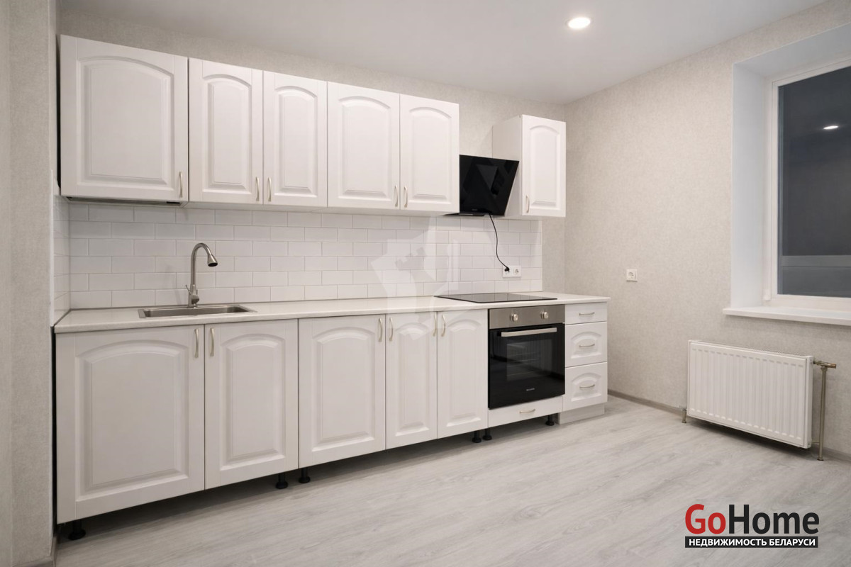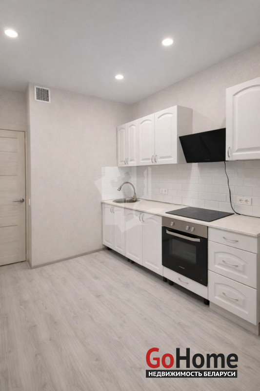 Просторная кухня с новым кухонным гарнитуром и встроенной техникой (варочная поверхность, духовой шкаф, вытяжка).