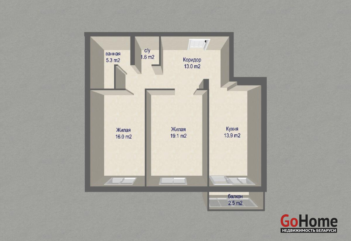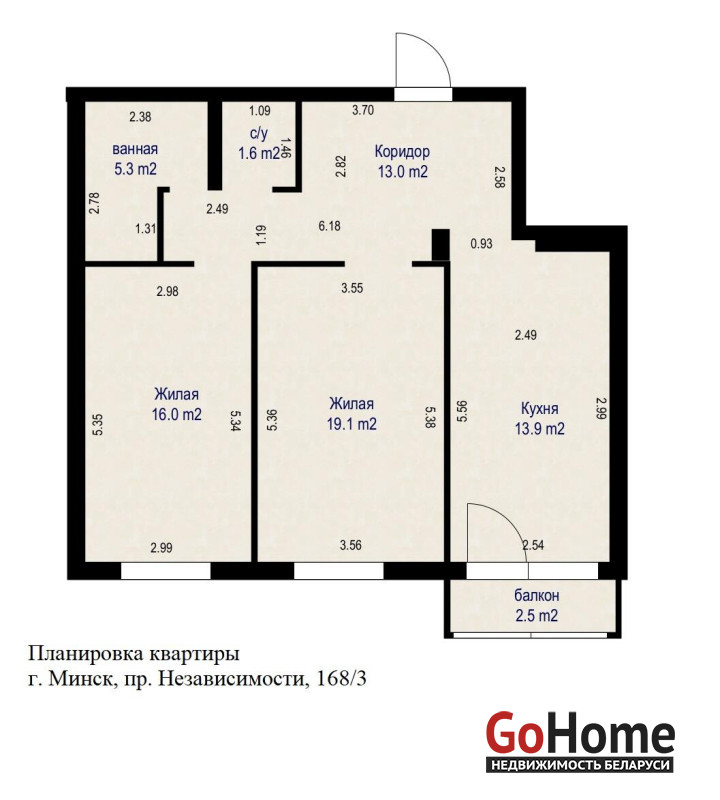 Общая площадь 68,9 кв. м., жилая площадь 35,1 кв. м, кухня 13,9 кв. м. высота потолков 2.70 м., просторный балкон.