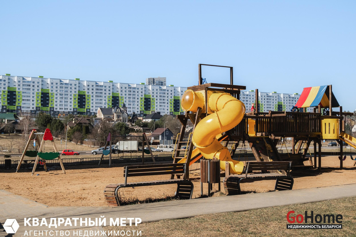 Аккуратный подъезд, благоустроенная территория двора с местами отдыха, безопасный и современный игровой комплекс на детской площадке.