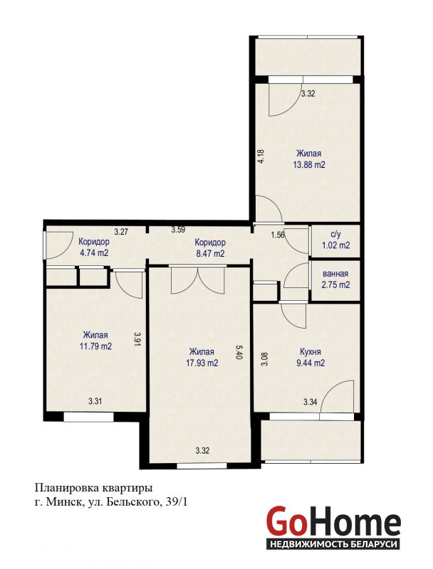 Общая площадь 71.75 кв. м., жилая площадь 43,6 кв. м, кухня 9,45 кв. м. высота потолков 2.50 м., два застекленных балкона. Комнаты раздельные.