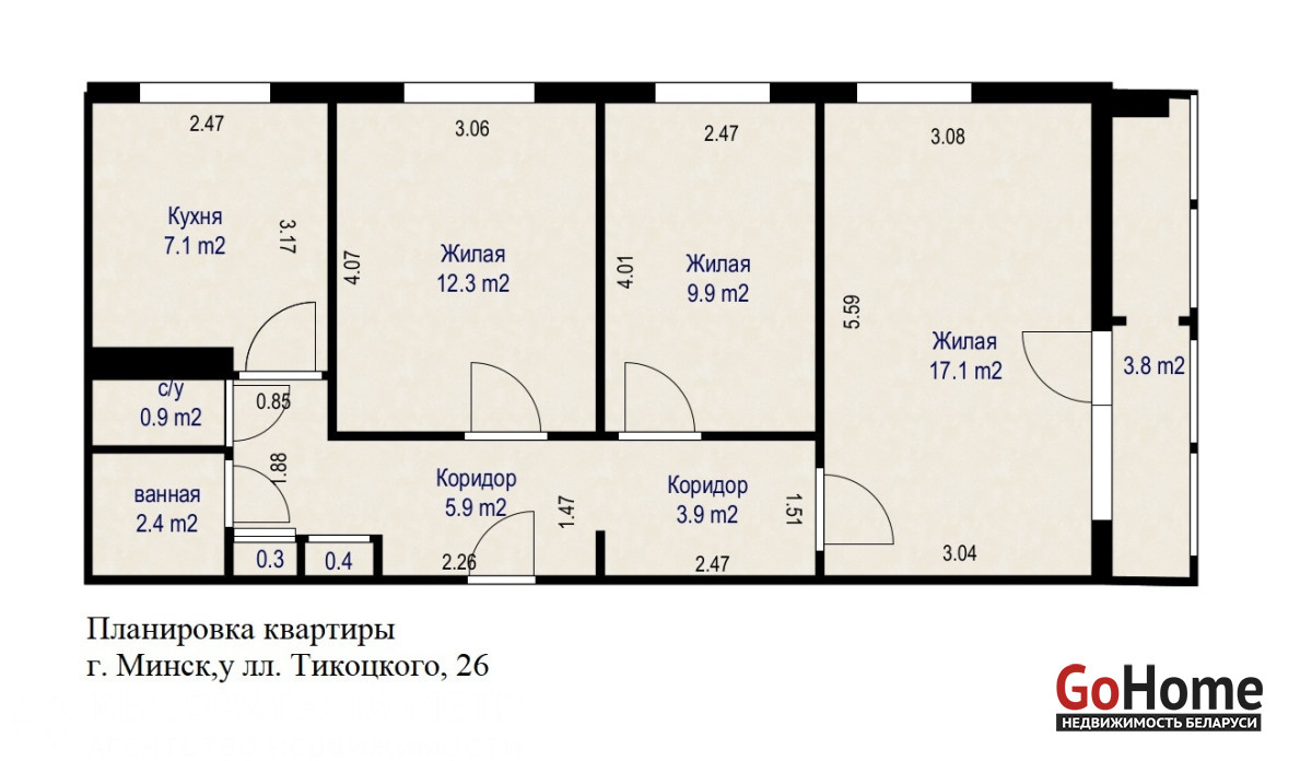 - Жилые раздельные комнаты: 17,1 кв.м., 12,3 кв.м., 9,9 кв.м.