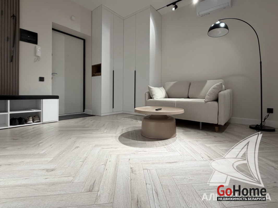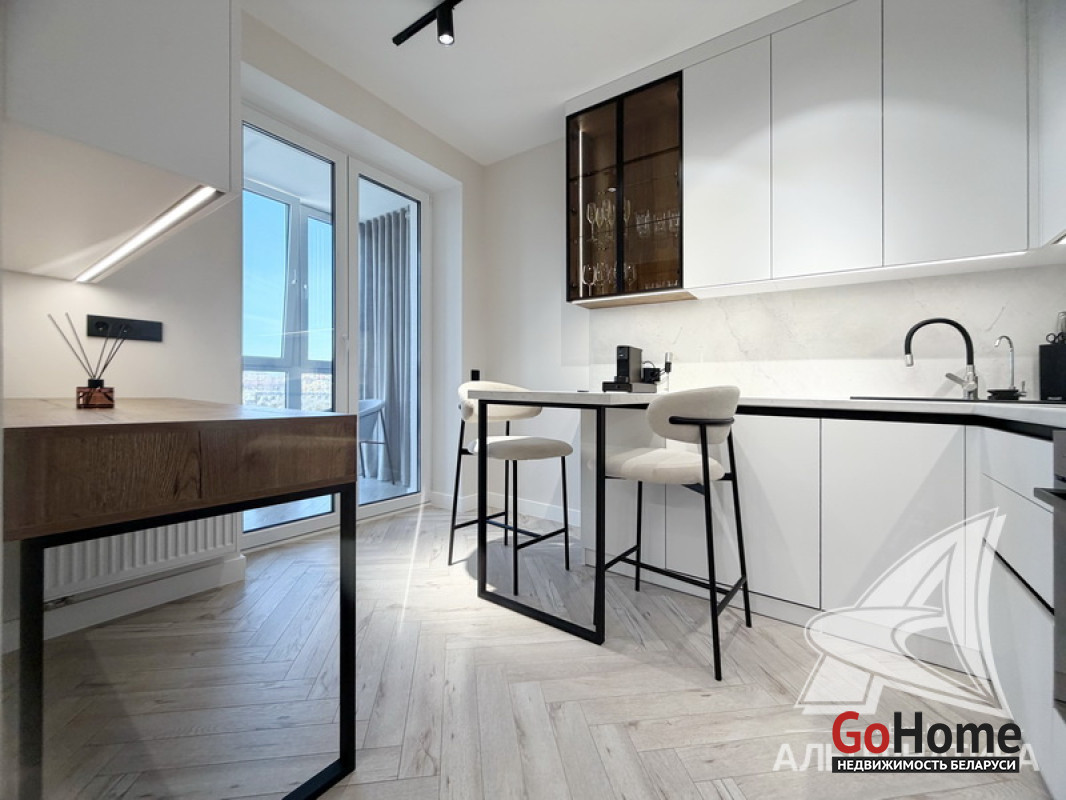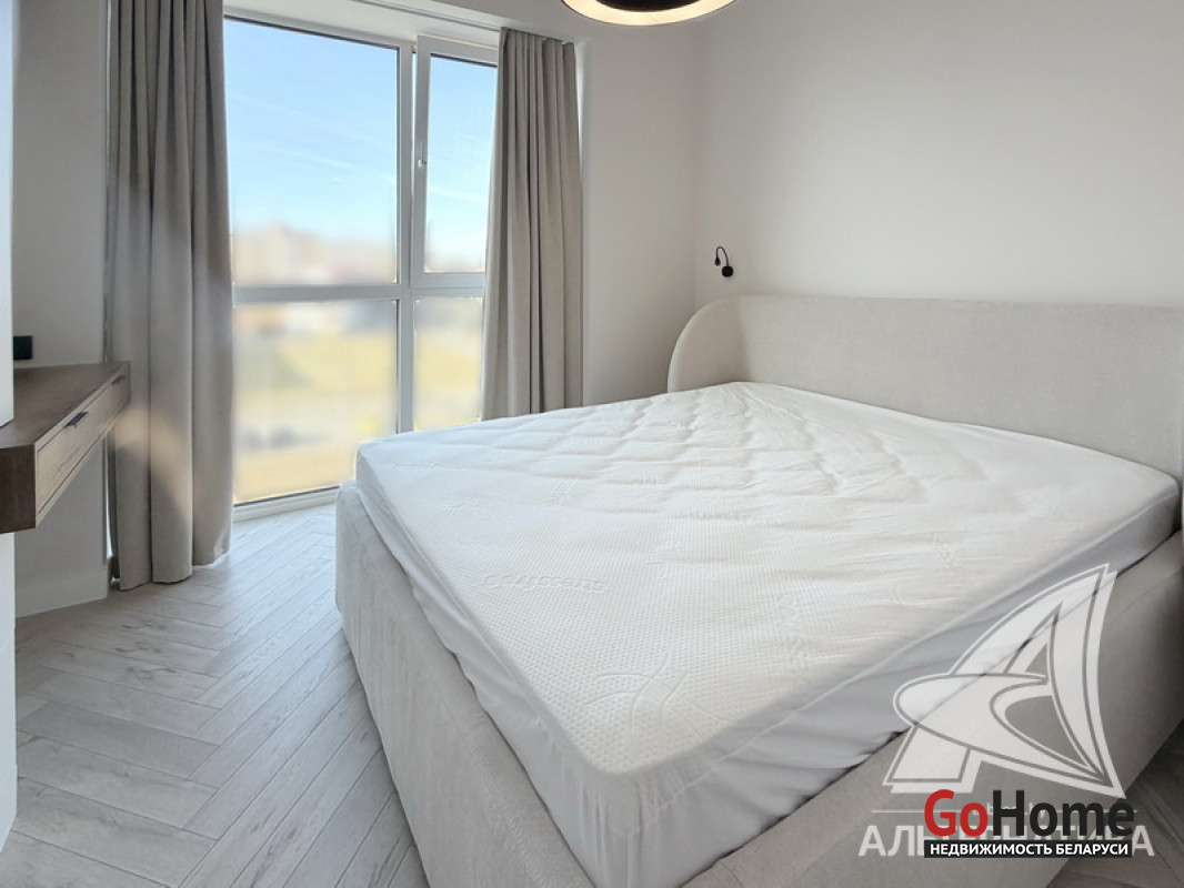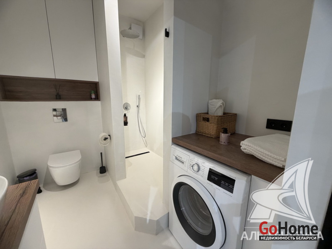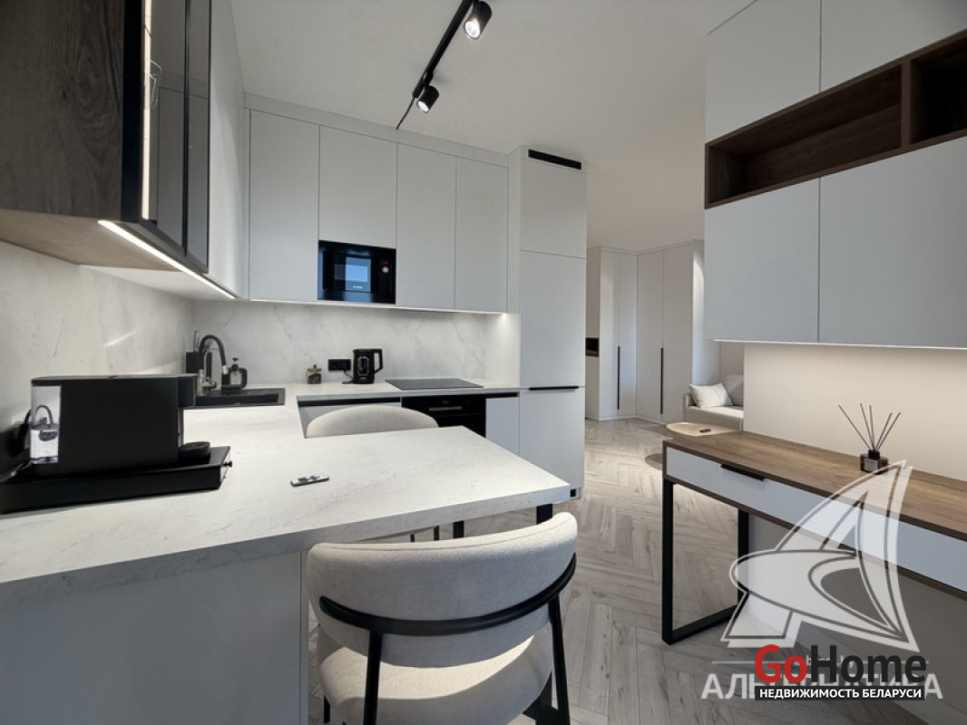 1-комнатная квартира, г. Брест, ул. Гоголя, 2024 г.п., 5 / 10 кирпич, 41,3 / 38,4 / 33,3 / -, санузел совмещенный, лоджия застеклена, стеклопакеты, окна во французском стиле (в спальне), межкомнатные двери скрытого монтажа, входная дверь металлическая, потолки из гипсокартона (2,73 м), полы (положены на стяжку) - ламинат, на стенах декоративная окраска, в санузле современная плитка и микроцемент, инсталляция, душевая кабина, кондиционер, домофон. Кухонный гарнитур, варочная поверхность, духовой шкаф, вытяжка, посудомоечная машина, микроволновая печь, холодильник, стиральная машина, барные стулья, диван, спальный гарнитур, шкаф, зеркало, сантехническое оборудование. Квартира с индивидуальными дизайнерскими решениями. Один грузопассажирский лифт. Установлен шлагбаум. Система видеонаблюдения. Во дворе парковка для автомобилей. Лот - 260303