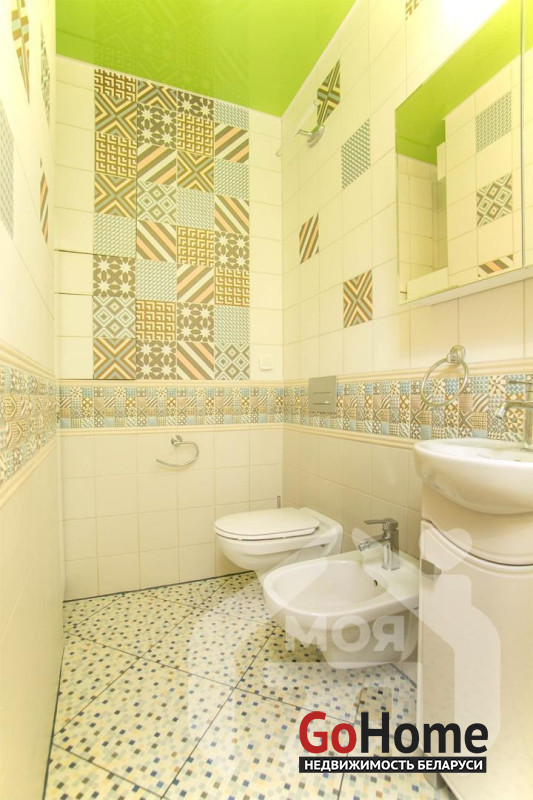 - Просторный совмещённый санузел облицован современной плиткой - стильно и аккуратно.