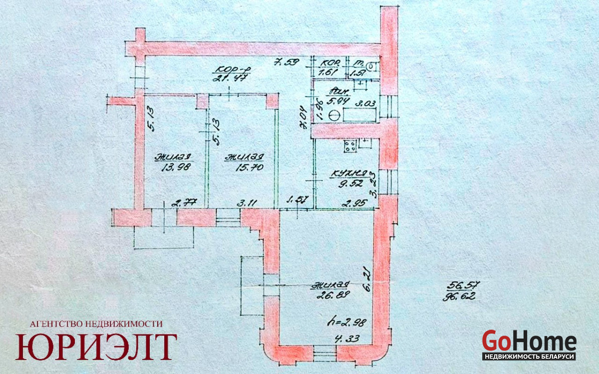 Жилая площадь 56.57 м