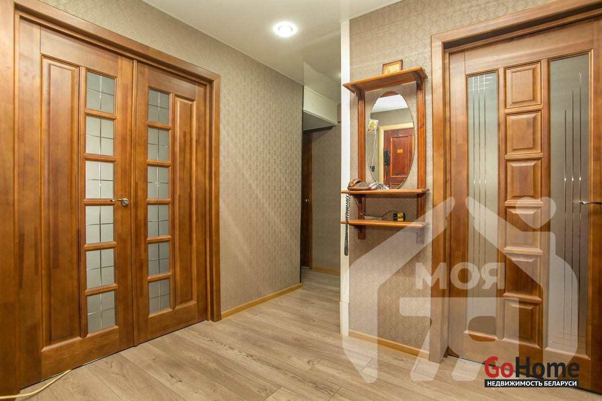 - По всей квартире стены оклеены обоями, потолки частично натяжные, в двух спальнях установлены стеклопакеты, межкомнатные двери из массива.