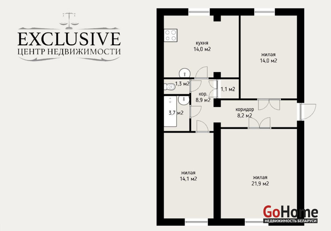 Функциональная планировка (общая площадь квартиры 82.2 кв., м ) включает 3 изолированные комнаты 21.9 кв.м., 14.1кв.м.. 14.0 кв.м.
