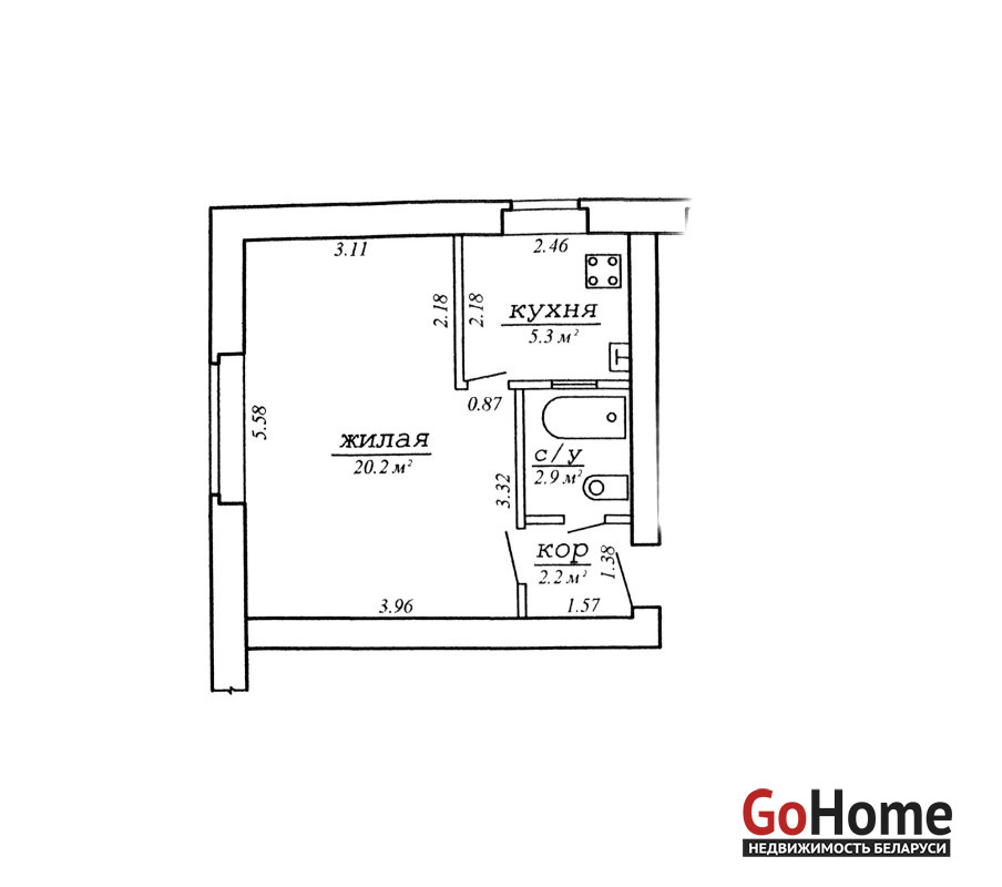 Общая площадь – 30,6 кв. м., жилая – 20,2 кв. м., кухня – 5,3 кв. м.