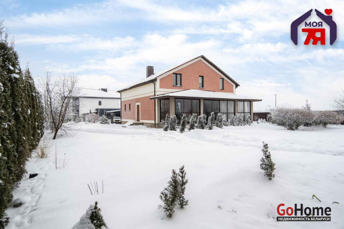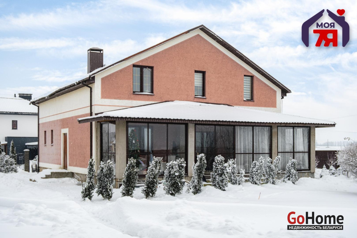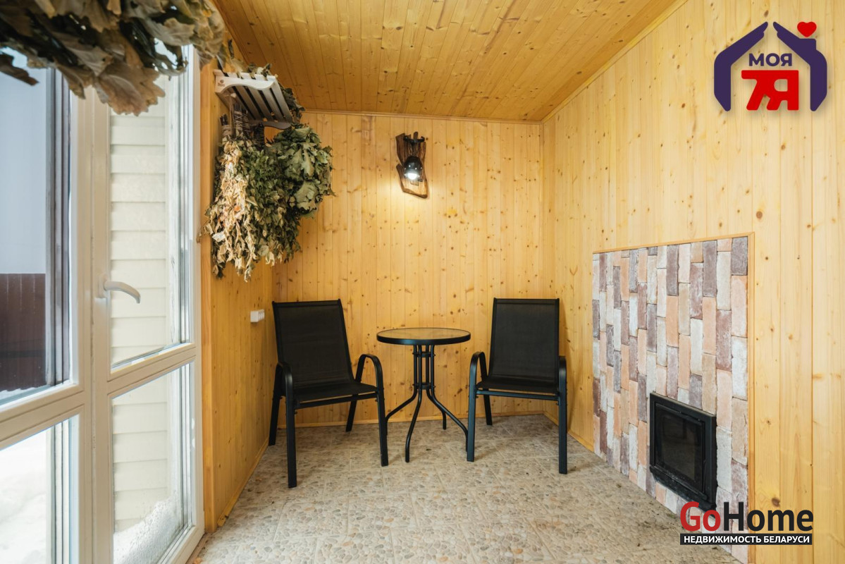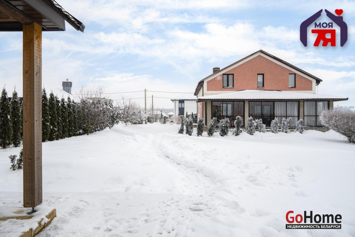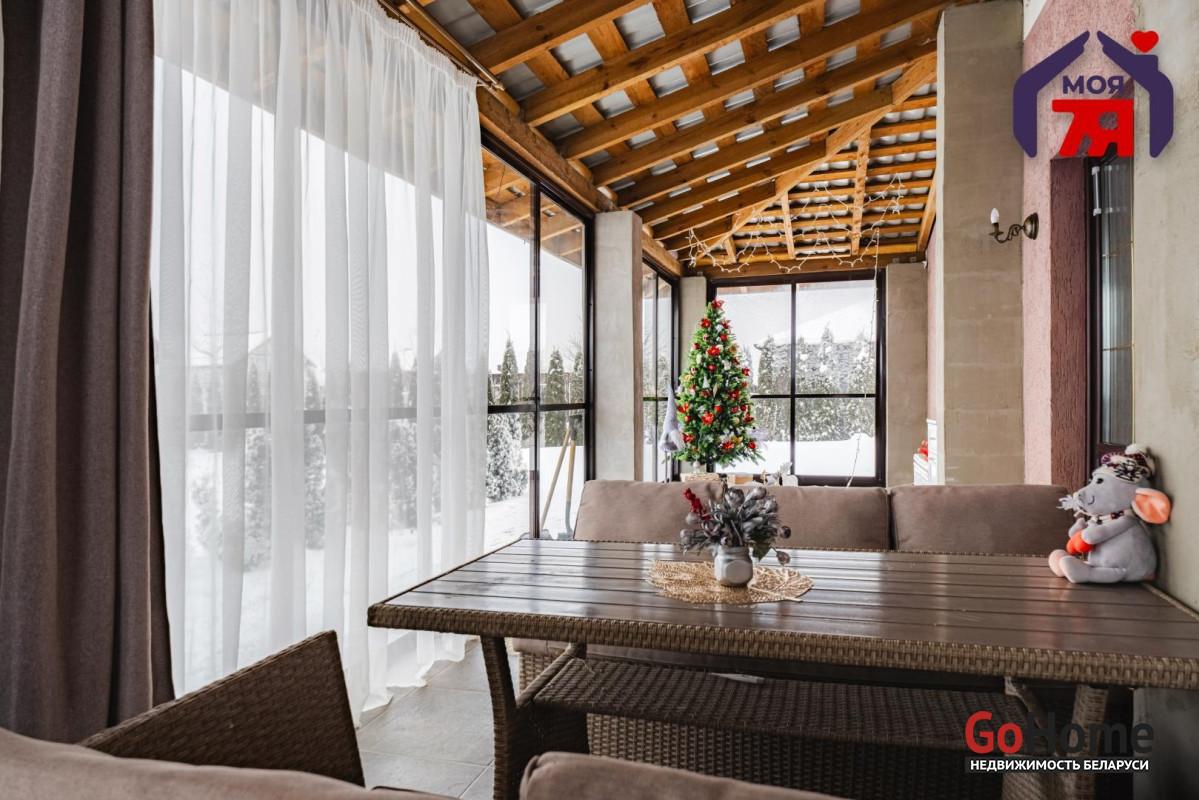 -Архитектура дома сдержанная и выразительная: аккуратный фасад, чёткие линии и большая остеклённая терраса, которая становится логичным продолжением жилого пространства. Терраса работает как полноценная зона отдыха -здесь одинаково приятно проводить летние вечера и уютные зимние выходные, наблюдая за участком и природой вокруг.