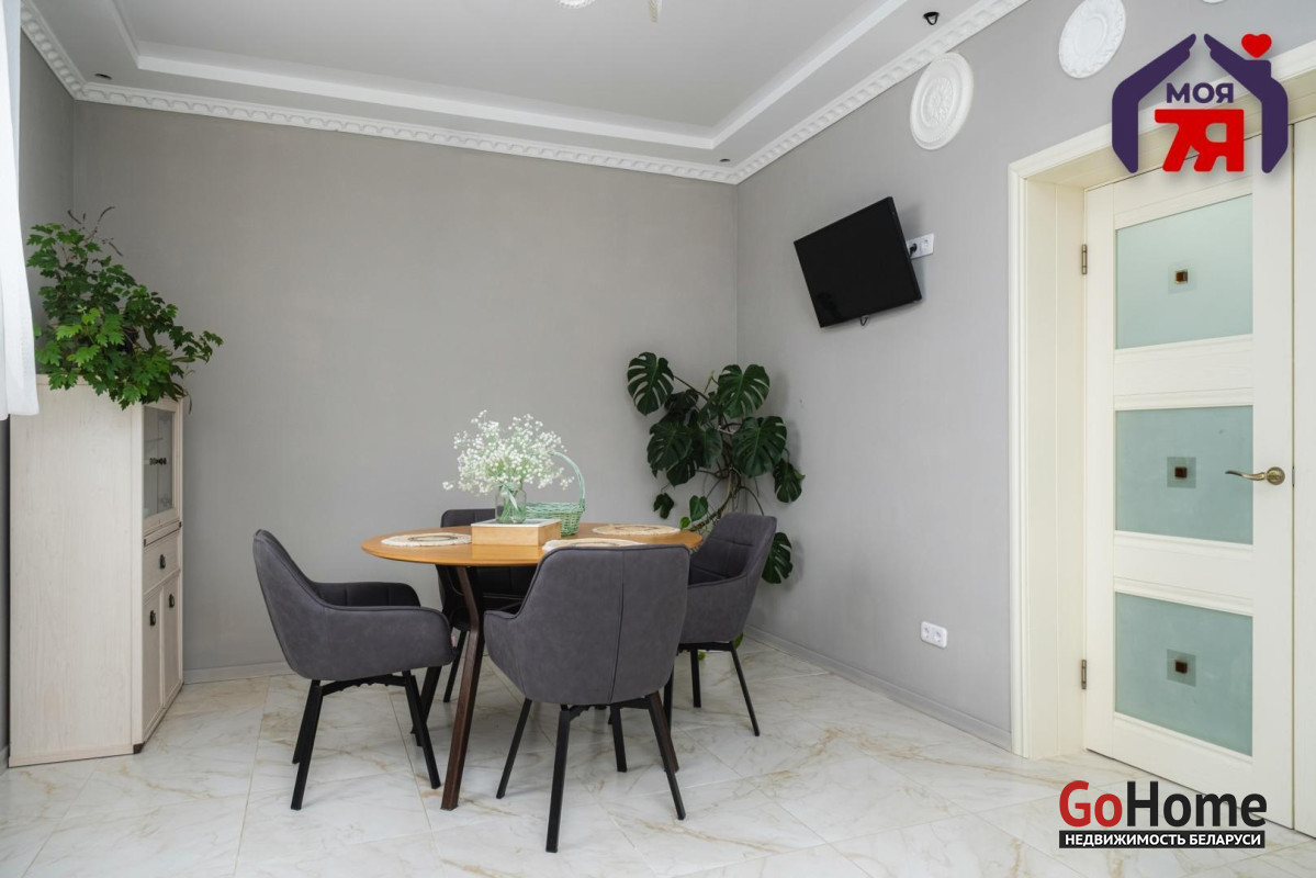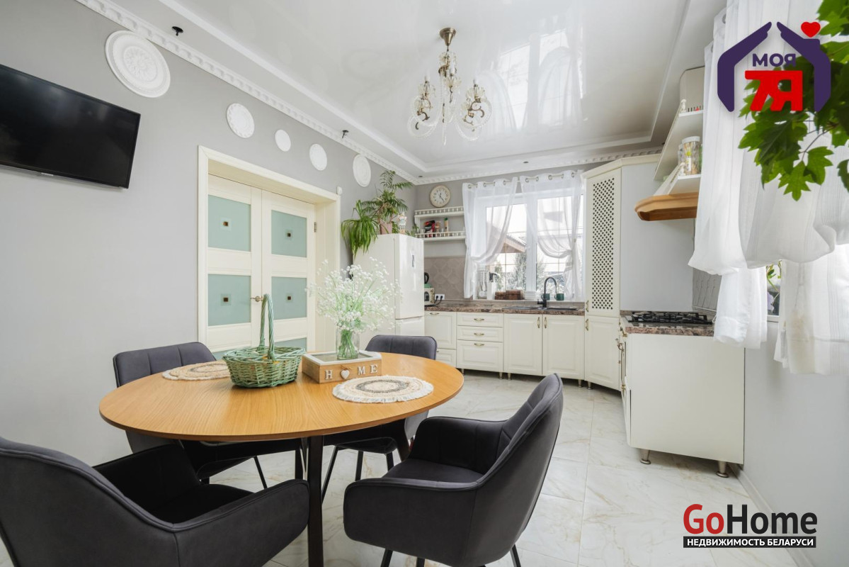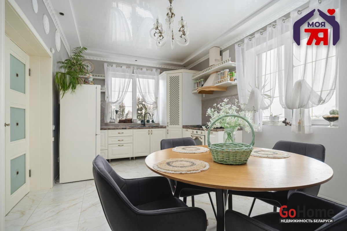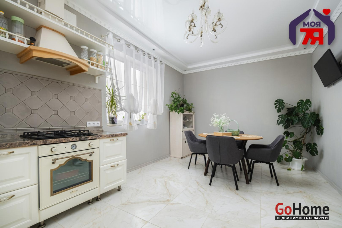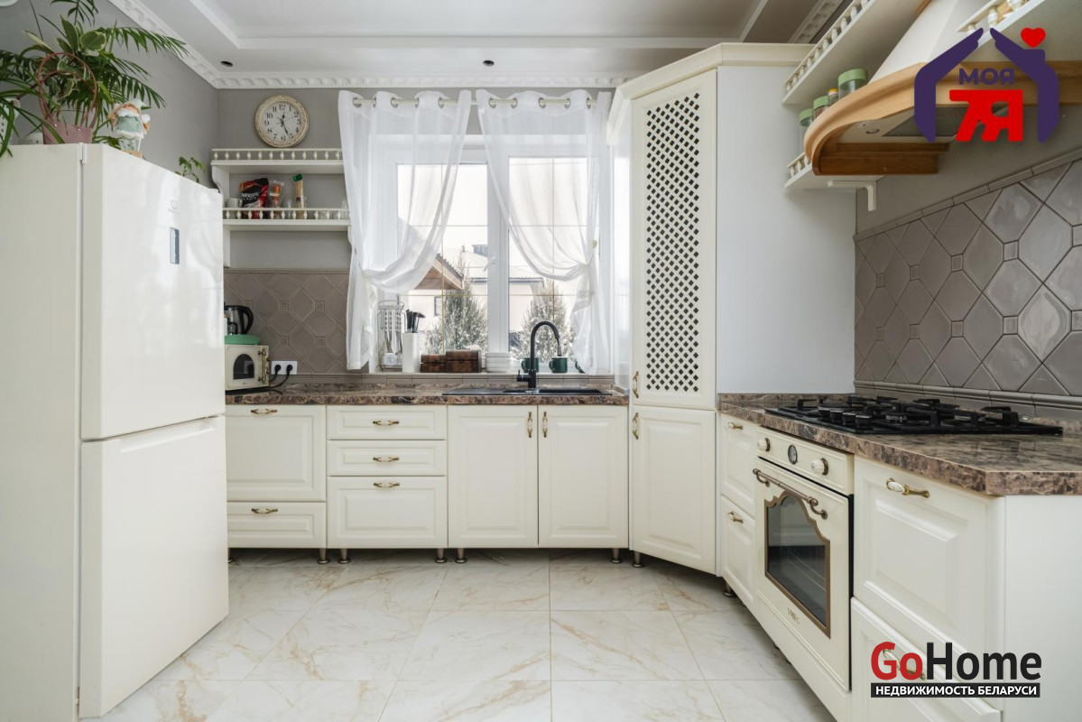 -Кухня оформлена в светлой, элегантной стилистике. Классический кухонный гарнитур с каменной столешницей, качественной фурнитурой и встроенной техникой выглядит стильно и актуально. Обеденная зона органично вписана в пространство, а за счёт окон и светлой отделки кухня всегда наполнена естественным светом. Это удобное и тёплое место для повседневной жизни и встреч с близкими.