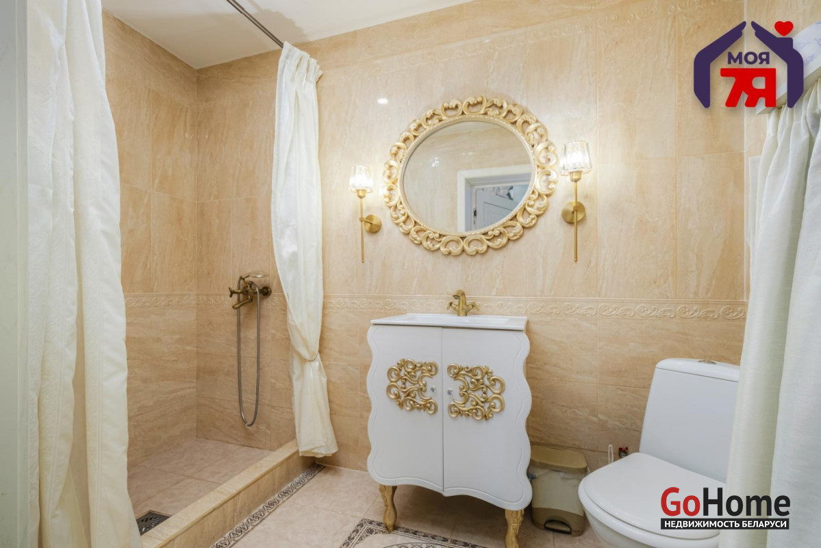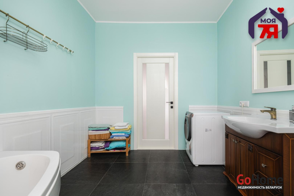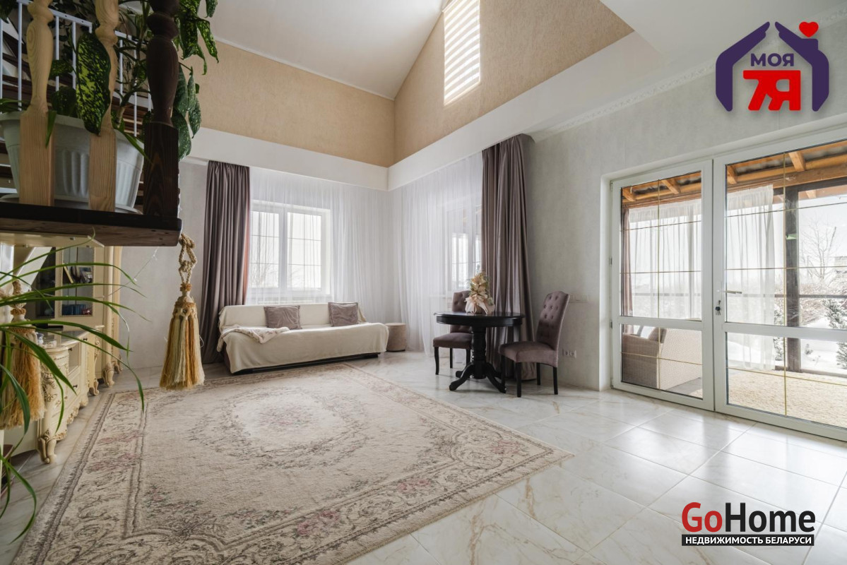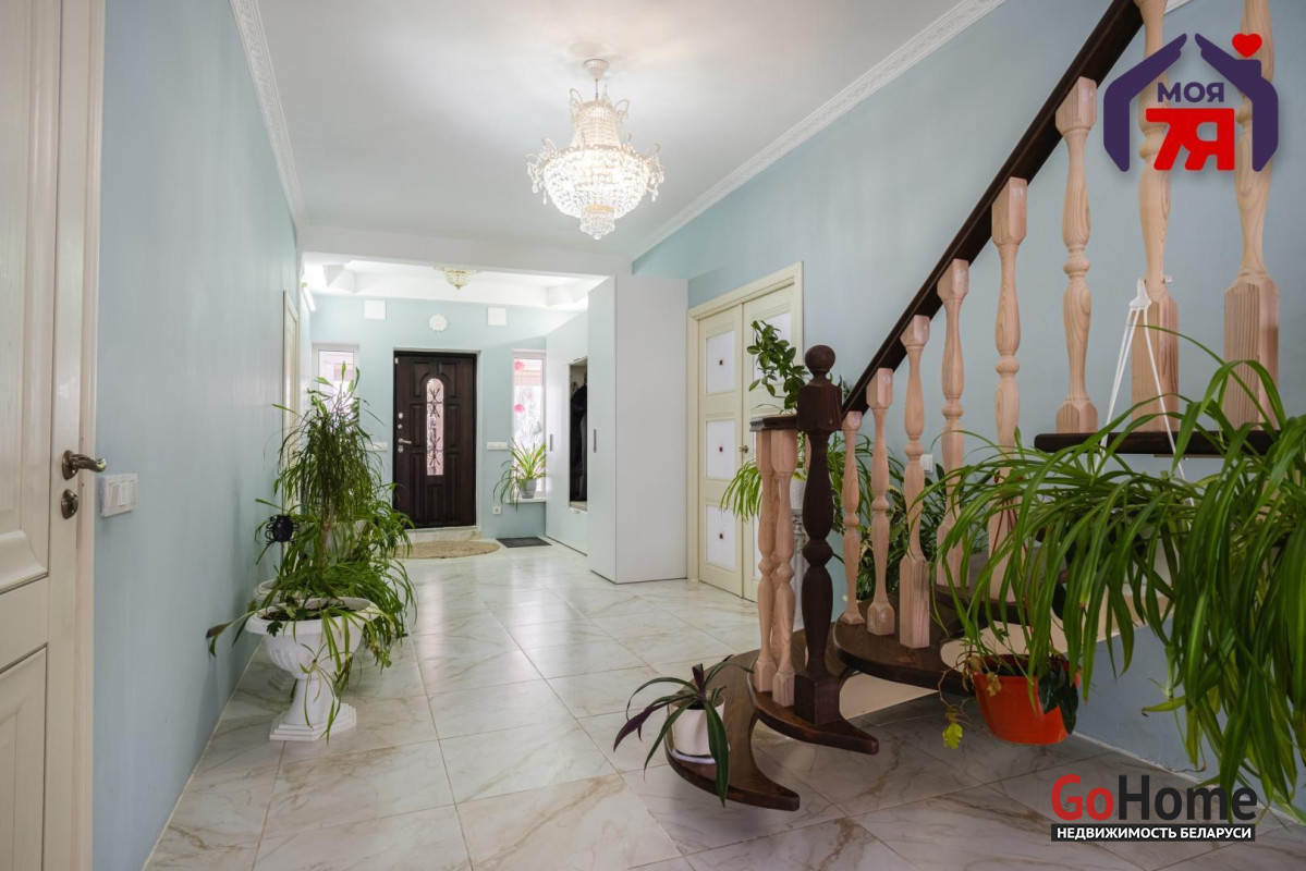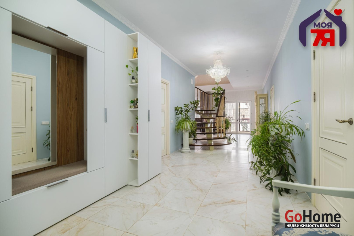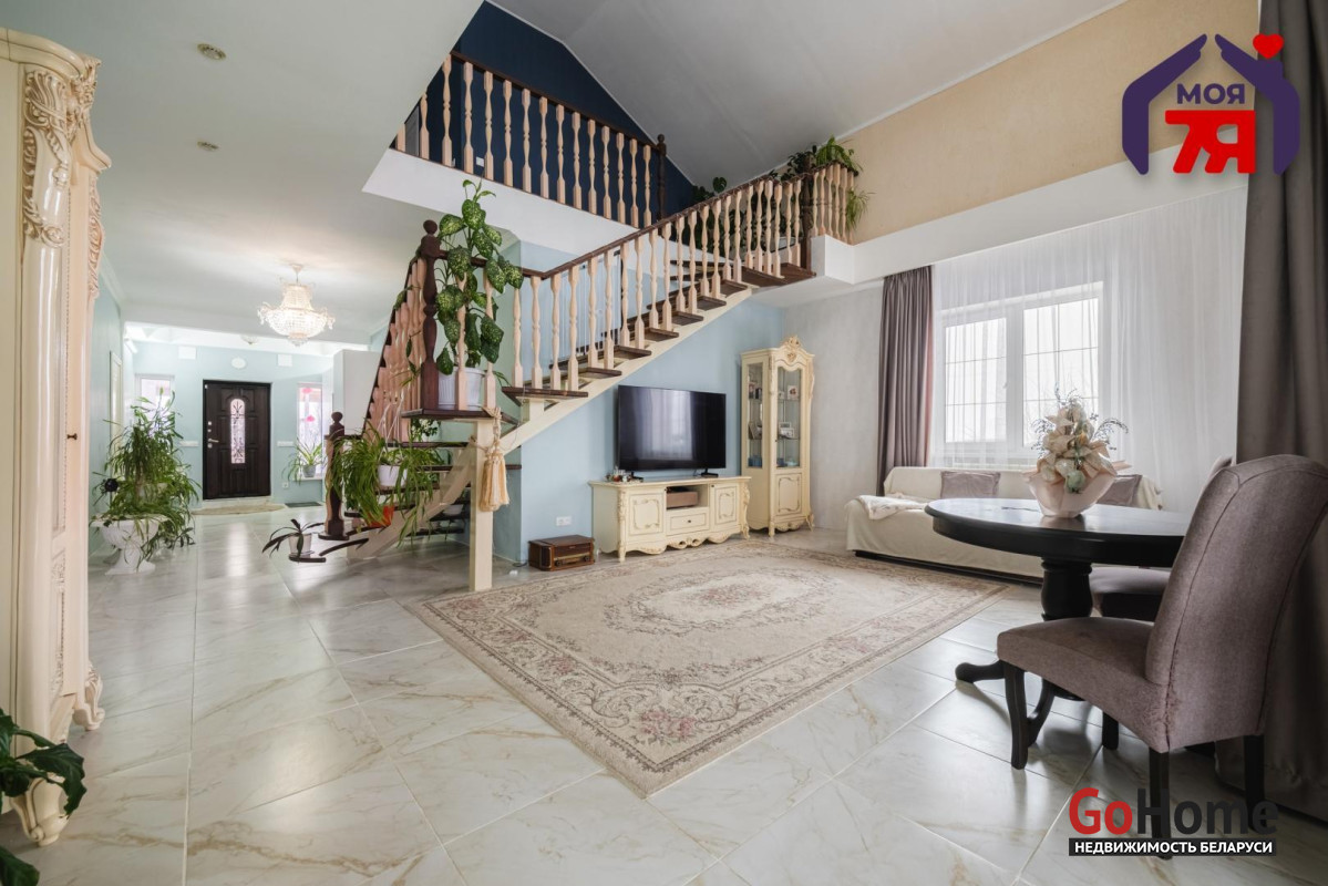 -Интерьер выдержан в спокойной, благородной палитре, с классическими формами и качественной мебелью, подчёркивающей статус дома. На полу - практичная плитка с мраморной фактурой, долговечная и уместная как с точки зрения эксплуатации, так и визуального восприятия, а также уложен качественный ламинат.