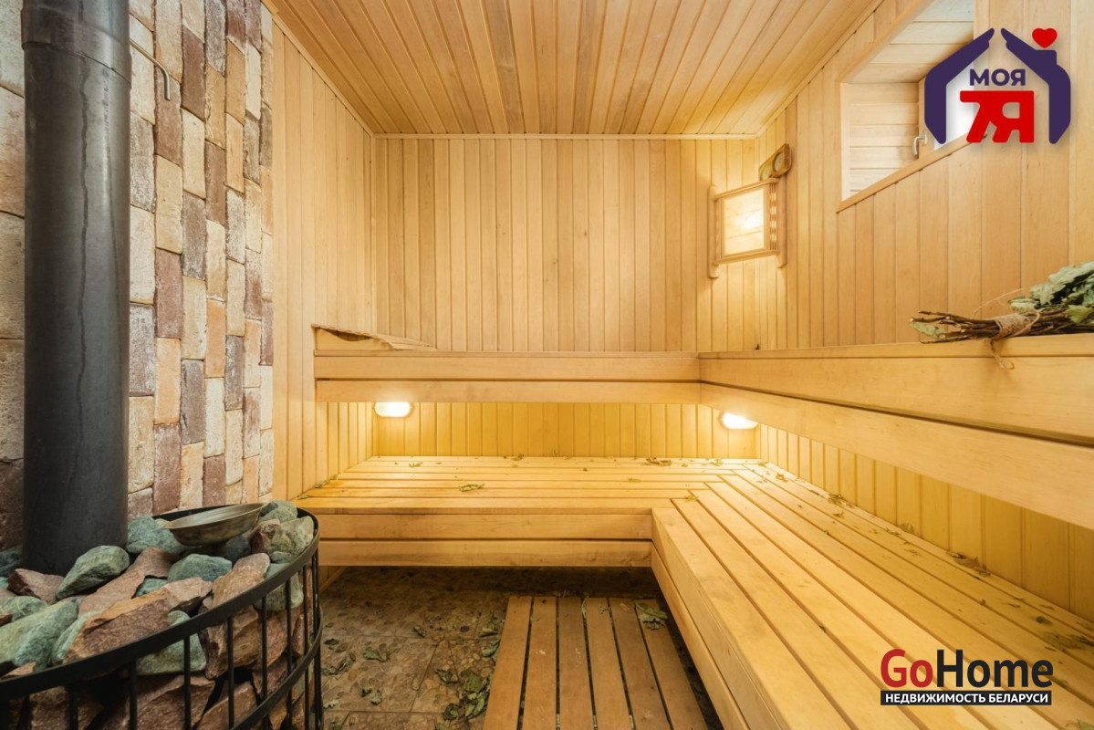 -Отдельного внимания заслуживает собственная сауна, выполненная с использованием натурального дерева и камня, она является полноценной зоной восстановления и отдыха.