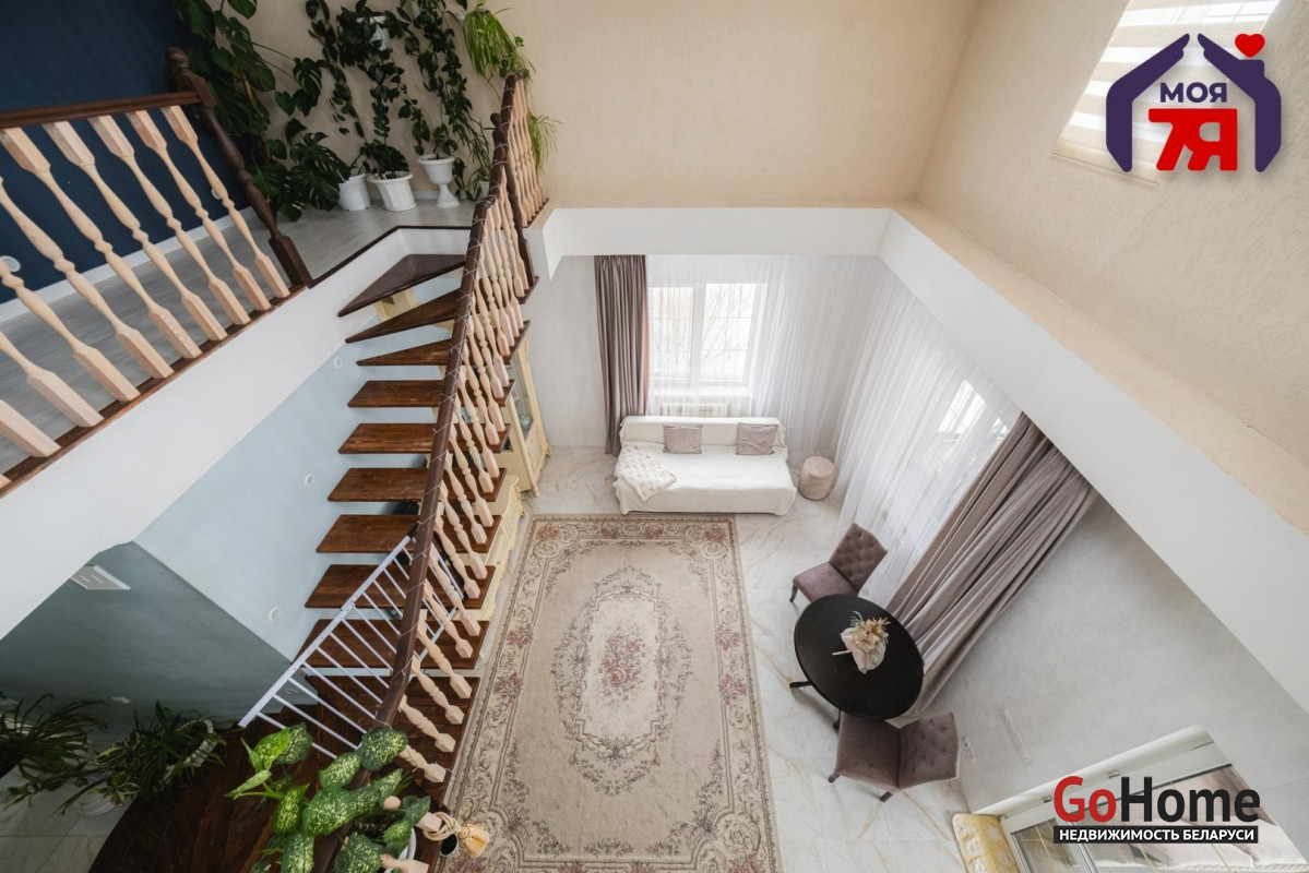 -Внутреннее пространство выстроено вокруг ощущения света и объёма. Просторная гостиная формирует центр дома: высокие потолки, открытая лестница на второй уровень и балюстрада создают воздушное, свободное пространство без ощущения перегруженности.