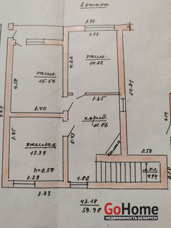 На втором этаже имеется холл с камином, три жилые комнаты размером 13,39 кв.м., 14,22 кв.м. Комната размером 15,57 кв.м. имеет выход на балкон.