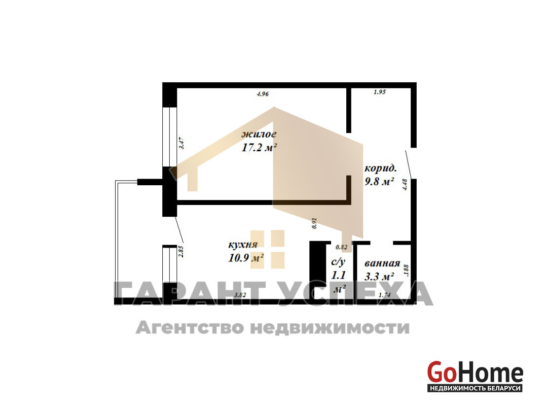 Общая площадь квартиры составляет 42,3 м² (по СНБ 45,2 м²); жилая площадь 17,2 м²; кухня 10,9 м². Высота потолков - 2,64 м. Окна ПВХ, входная металлическая дверь.