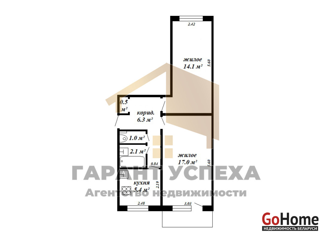 Удобная планировка: две просторные комнаты 17,0 кв.м. и 14,1 кв.м, балкон с выходном из комнаты, функциональная кухня - 5,4 кв.м, коридор - 6,3 кв.м, раздельный санузел.