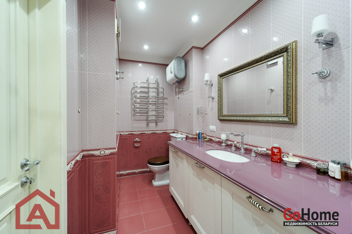 Особое внимание уделено санузлам. В ванной — стильная плитка с элементами мелкой мозаики, угловая ванна, современная мебель с каменной столешницей и продуманная система хранения. Техника представлена брендом SMEG (стиральная машина), а сантехника — итальянского производства.