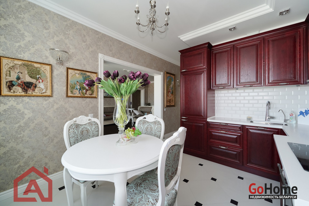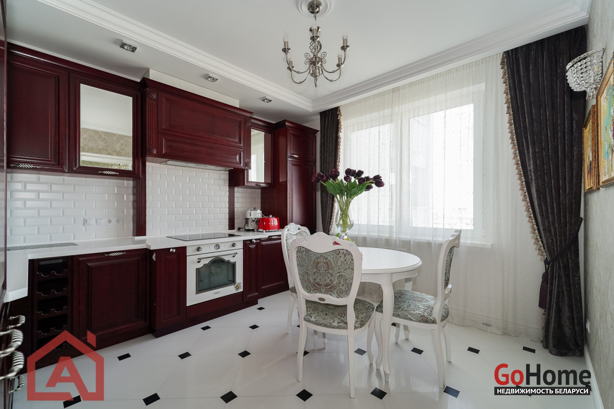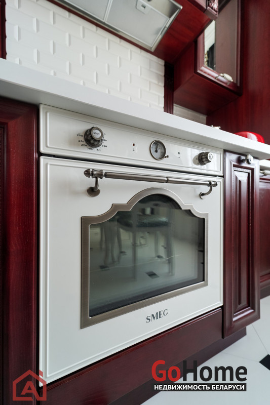 -Просторная кухня-столовая оформлена красиво, нарядно и функционально: матовые фасады из массива дерева гармонируют с белоснежной каменной столешницей, создавая идеальный баланс между основательностью и домашним уютом. Рабочая зона выложена белой плиткой с аккуратной геометрией, оснащена встроенной и отдельно стоящей техникой SMEG. Продуманная электрика и многоуровневая подсветка делают пространство удобным для готовки, приема пищи и отдыха.