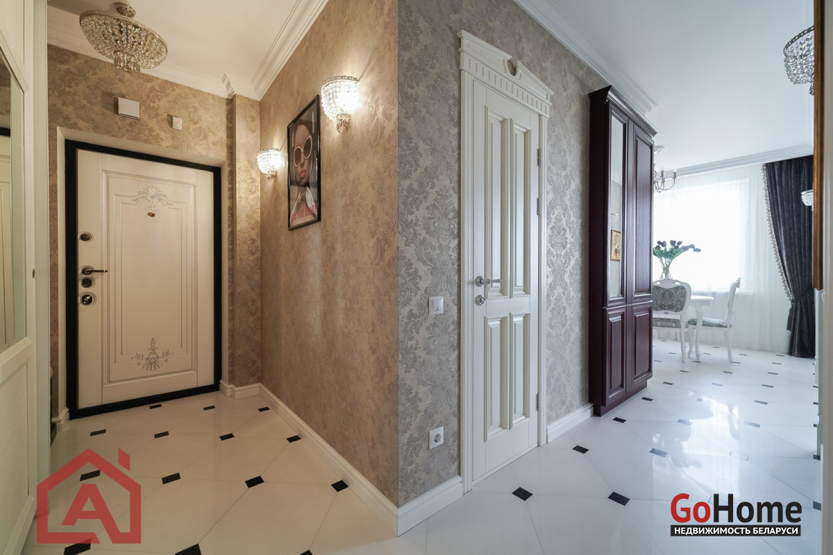 Прихожая встречает безупречным стилем: качественный пол, красивые двери, элегантные светильники и надежная металлическая входная дверь.