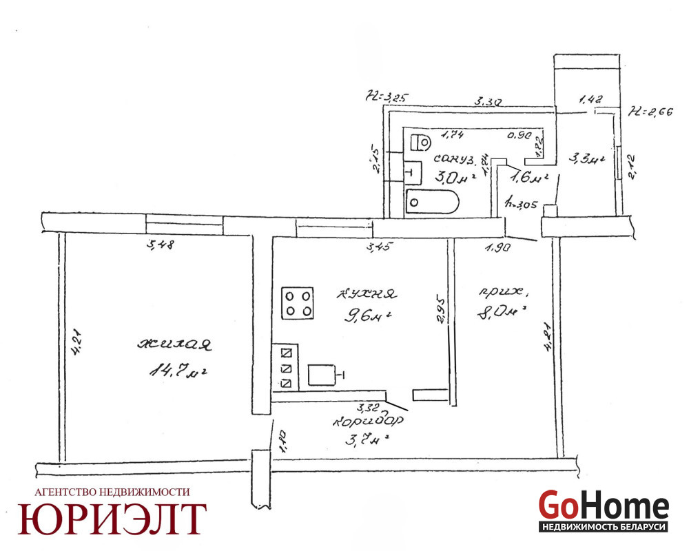 Общая площадь по СНБ - 43,8 м², общая жилая - 40.5 м², жилая - 14.7 м², кухня - 9,6 м², с/у - совмещен.
