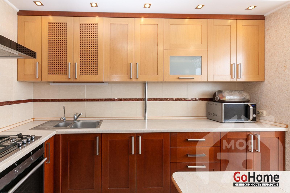 - Кухня 8,5 м2 — гарнитур из массива дуба фирмы Явид, качественная бытовая техника, рабочая зона выложена плиткой.