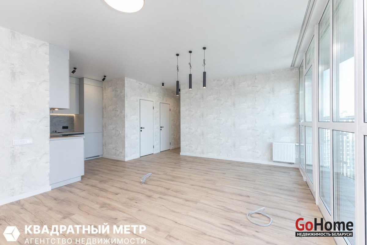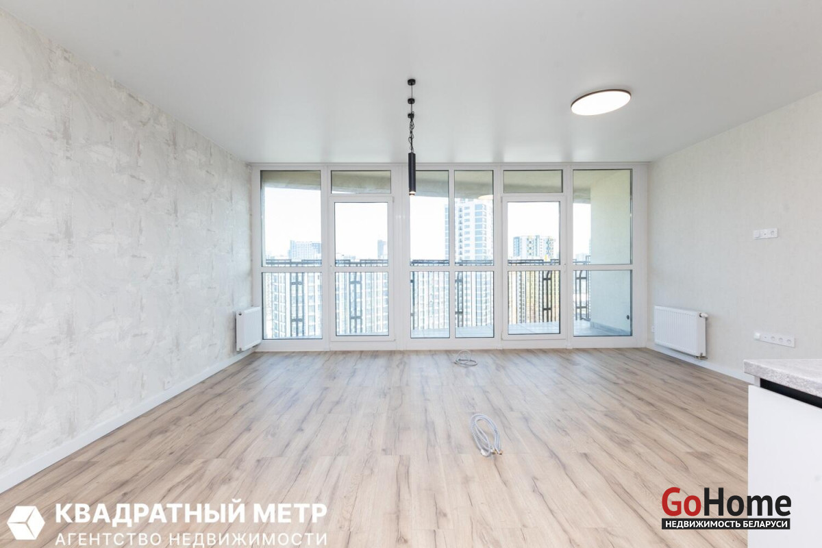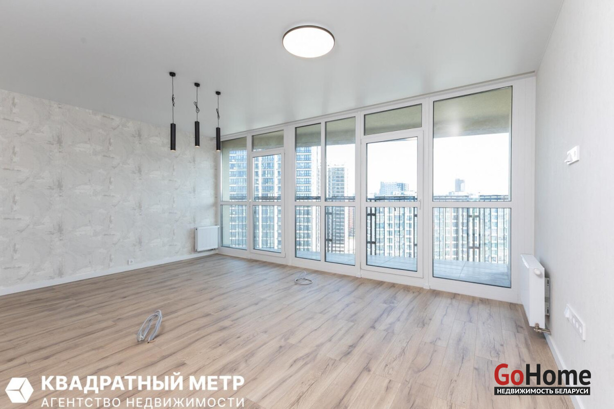 Две изолированные спальни и большая гостиная с кухонным оборудованием с панорамным остеклением на всю стену. Раздельный сан. узел. Две просторные лоджии.