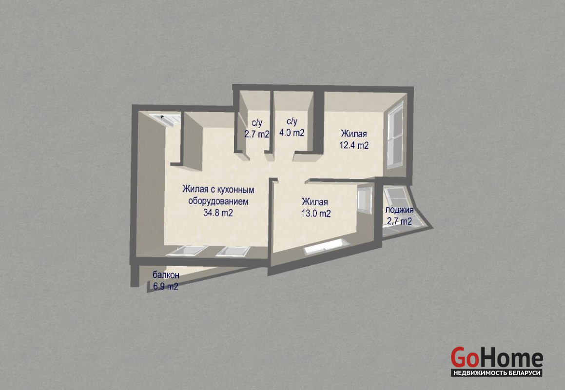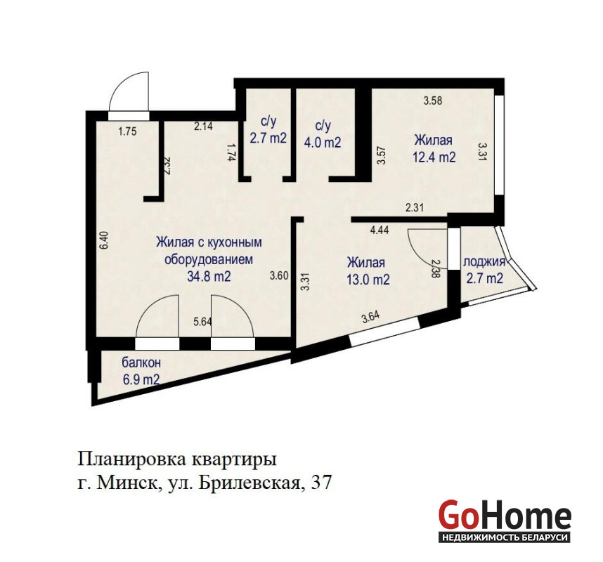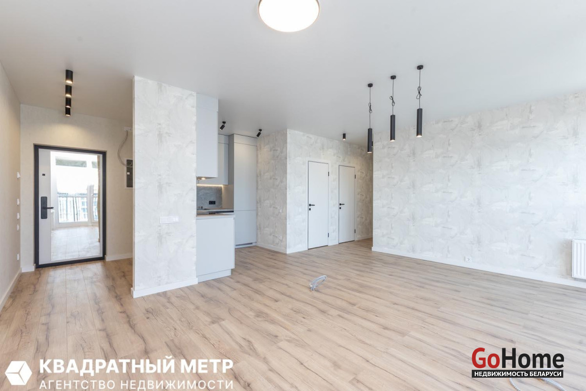 Общая площадь 66,9 кв. м., жилая площадь 60,2 кв. м., кухня-гостиная 34,8 кв. м., высота потолков 2.75 м.