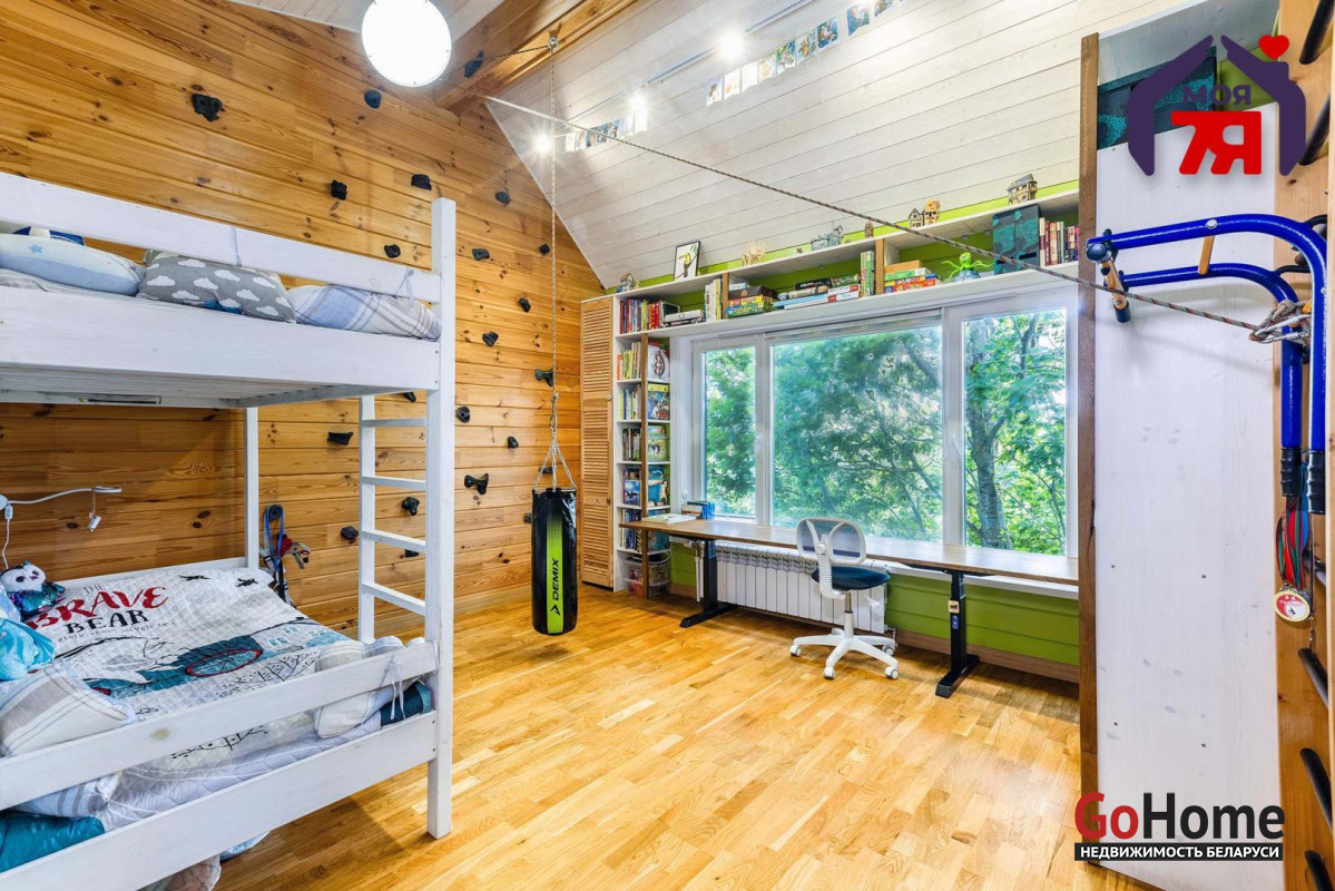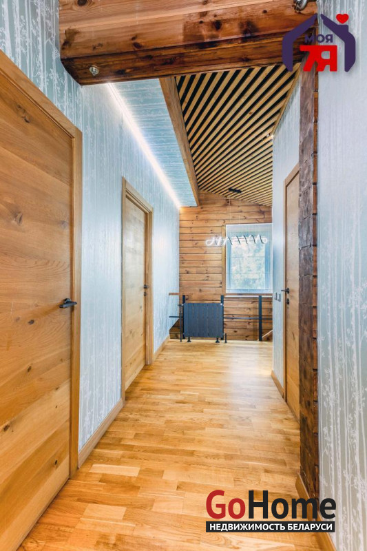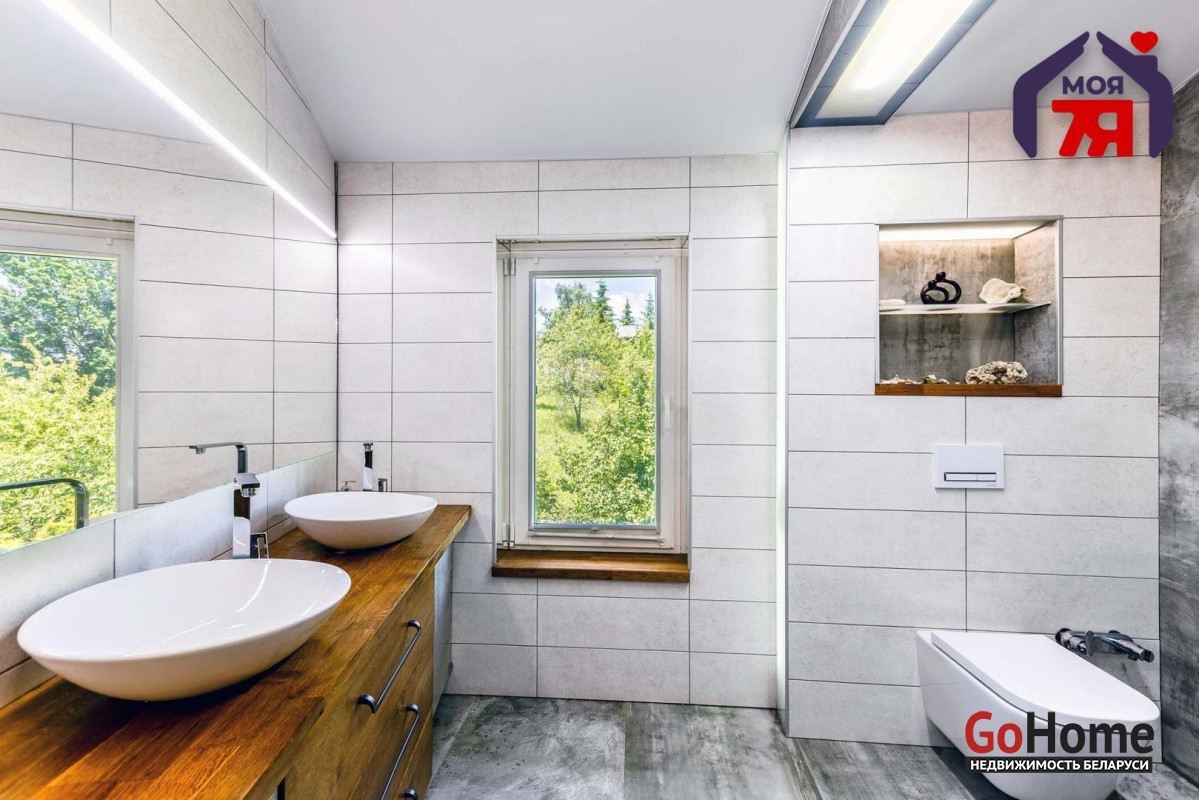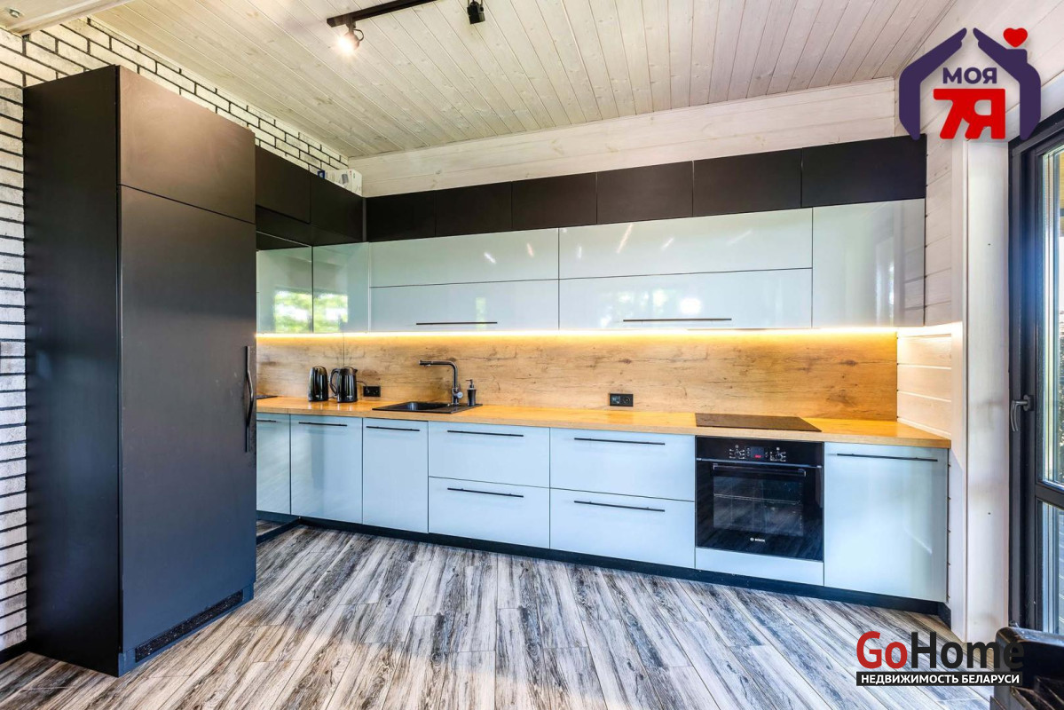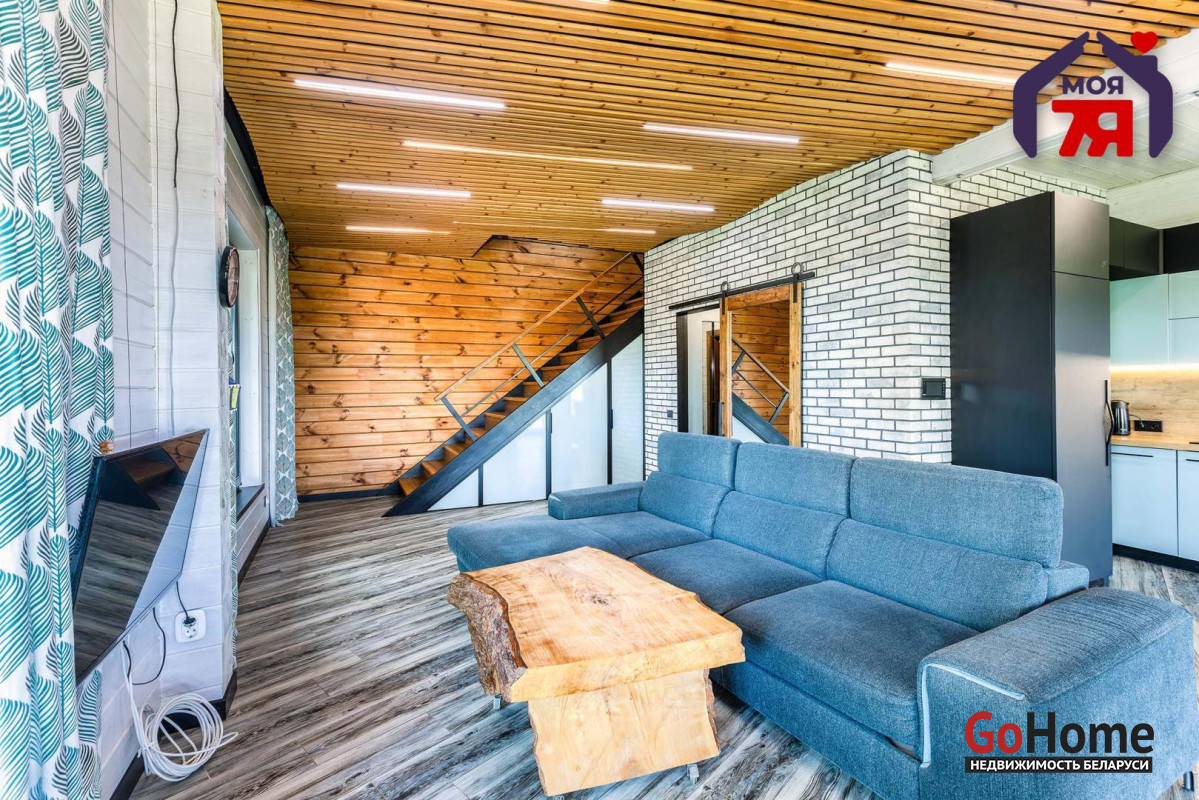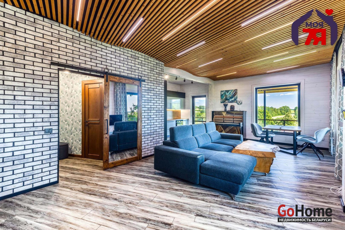 -В отделке использовано натуральное дерево и декоративный кирпич, которые создают атмосферу уюта. Просторная гостиная с панорамными окнами наполняется светом и открывает вид на зелёные пейзажи. Элегантная кухня со встроенной техникой и продуманной подсветкой, а также просторная ванная с видом на природу и качественной сантехникой подчеркивает высокий уровень комфорта этого дома.