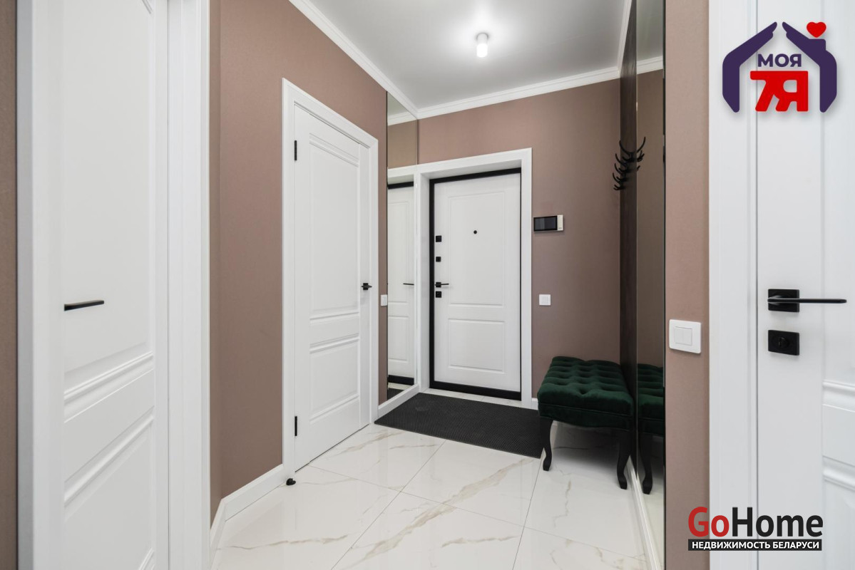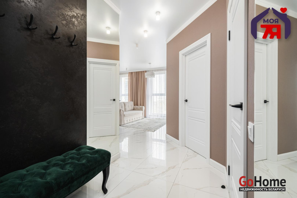 - Квартира спроектирована с учетом максимального удобства и гармонии пространства. Прихожая оформлена в светлых тонах: на полу - итальянская плитка формата 120×60, стены украшены зеркалами и декоративным керамогранитом, потолок натяжной. Здесь же находится вместительная гардеробная площадью 5 м2.